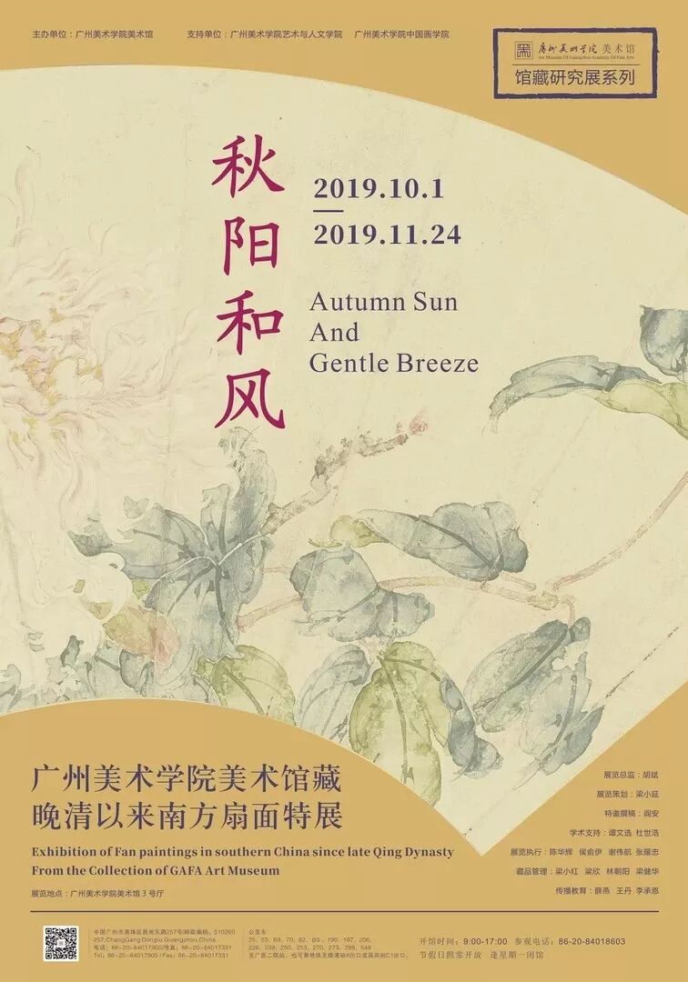 10月1日至11月24日,“秋阳和风——广州美术学院美术馆藏晚清以来南方扇面特展”在广州美术学院美术馆3号厅举行。此次展览挑选出来的展品囊括山水、花鸟、人物等不同题材,是一批始于上世纪五六十年代学校购藏的、作为辅助的教具性质的画作。有明确记载的经手购买人包括胡一川、关山月等先生,后又有陈少丰先生主持著录工作。