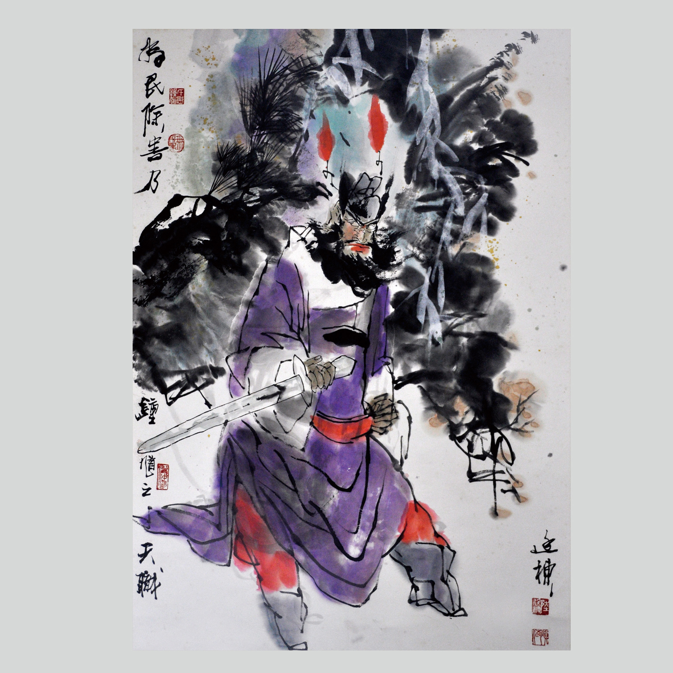 钟馗是中国著名的民间神之一,后被道教纳入神仙体系,他的主要功能是捉鬼。他之所以被人们所喜爱是因为他驱邪捉鬼,为名除害。这样才华横溢、满腹经纶、正气浩然的人竟因相貌怪异而被恶人所害。这幅画很好的表达出钟馗正气浩然、刚直不阿的气质。