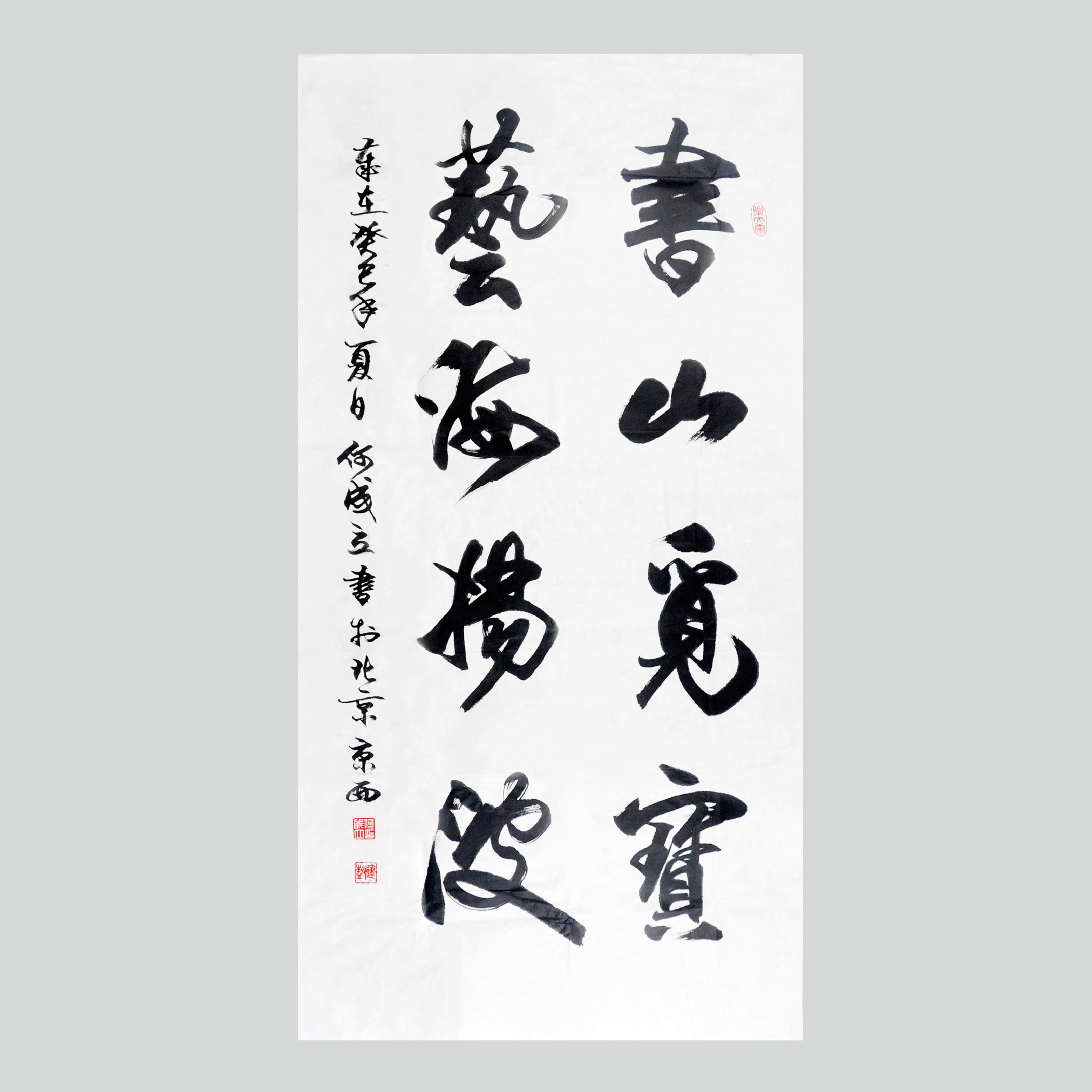 此幅作品气气势雄浑,大气磅礴。其作者何成立出生于北京,中国书画社会员 。二十世纪八十年代师从于赵家熹老师学习书法楷书,九十年代又求教于吴未淳老师学习行草,此间又得到了许多名家指导,如欧阳中石先生、张永明先生等。作品参加全国各类大展,并多次获奖。