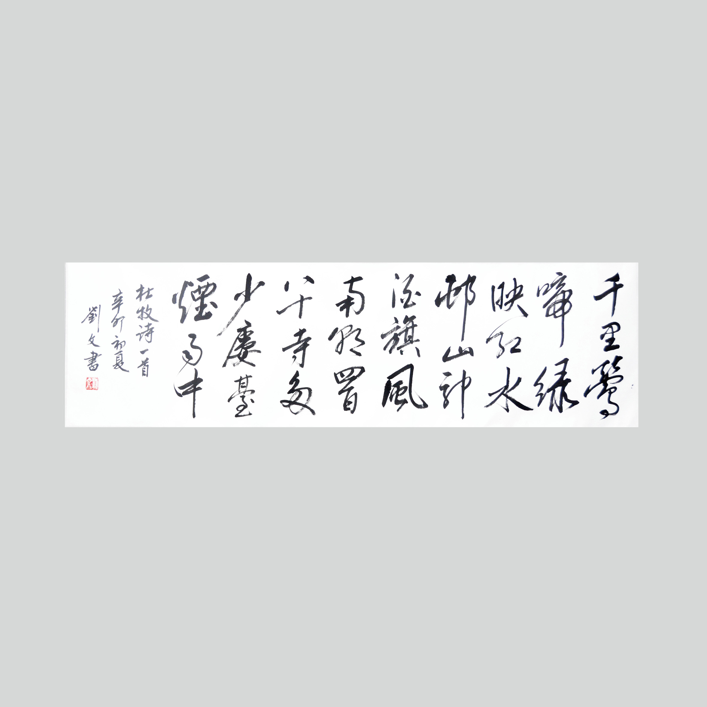 此书法作品的内容为杜牧的名作《江南春》,“千里莺啼绿映红,水村山郭酒旗风。南朝四百八十寺,多少楼台烟雨中。”此作品中的“啼”字如歌出喉,悦耳动听。“雨”字如江南的绵绵细雨,有温润之气。