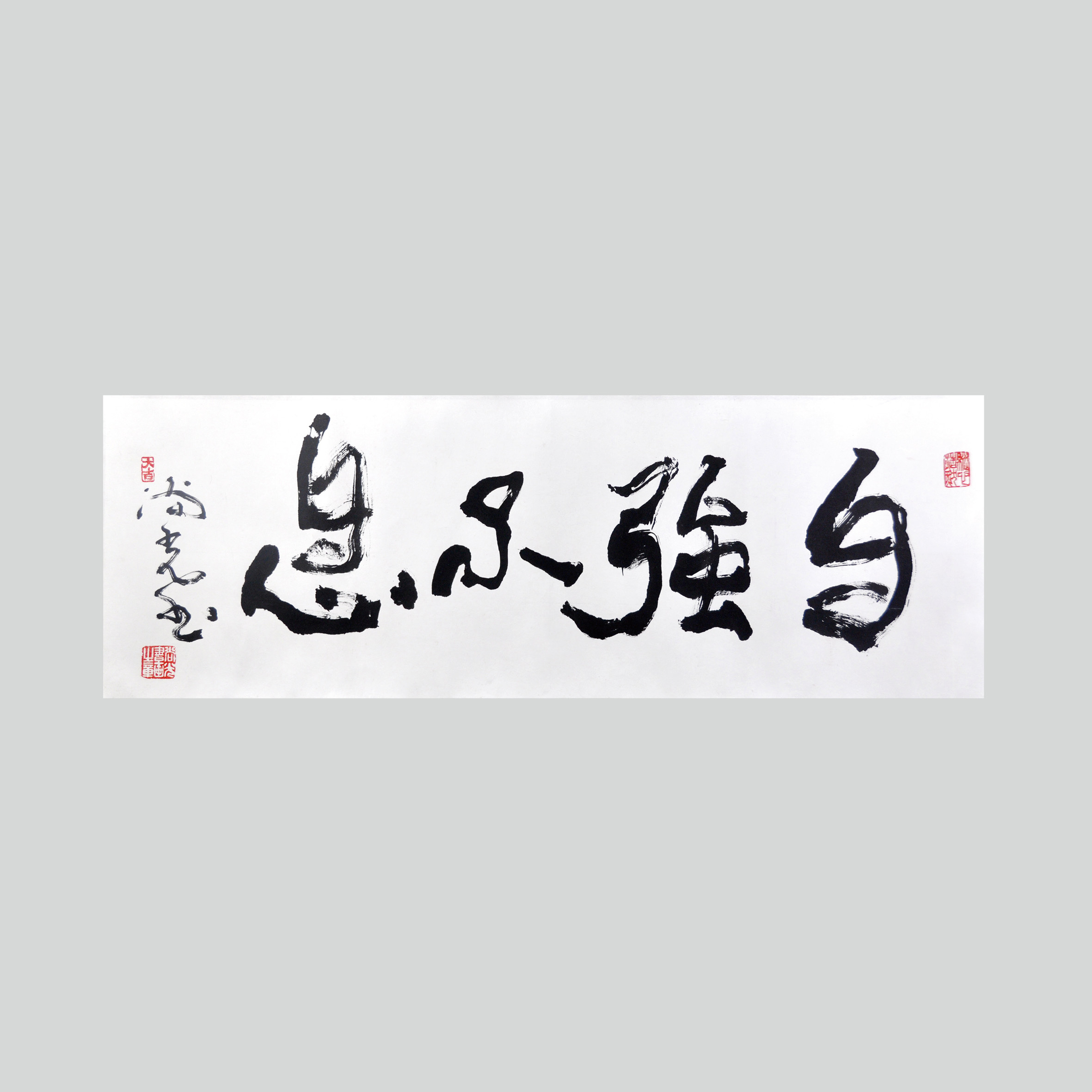 。“自”“息”二字中“自”不封闭,有不自满保持谦逊之意,“心”字上括“自”表明恪守真心,中间二字“强”字与“不”字相对照,强之大,不之小,此大小之分,近指刚柔,远指阴阳。万事万物在变化中,阴阳不断转化,自强方能不息。