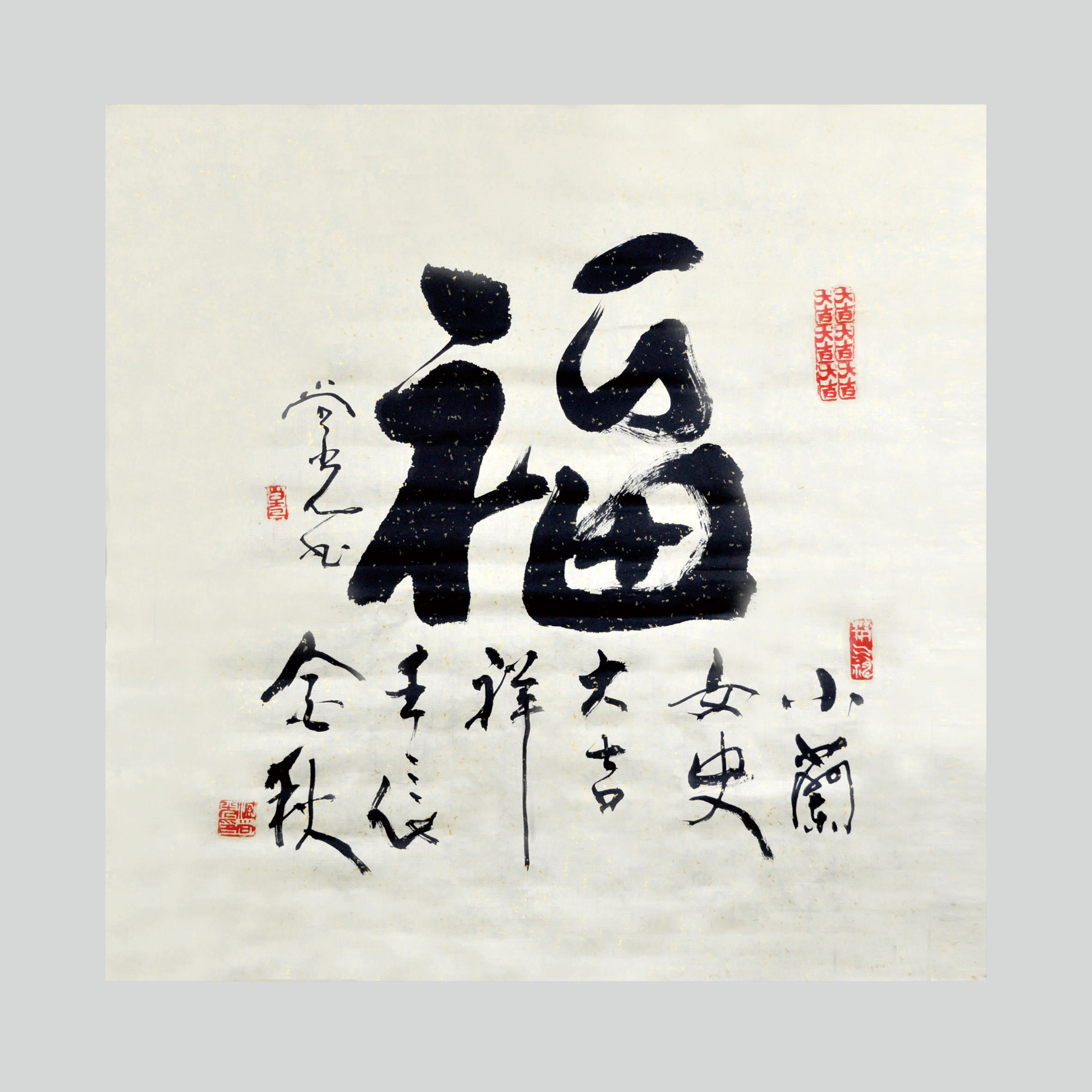 。整幅字运笔稳重舒然,题款相映成趣,以“福”字为中心,有身处福中惜福之意。