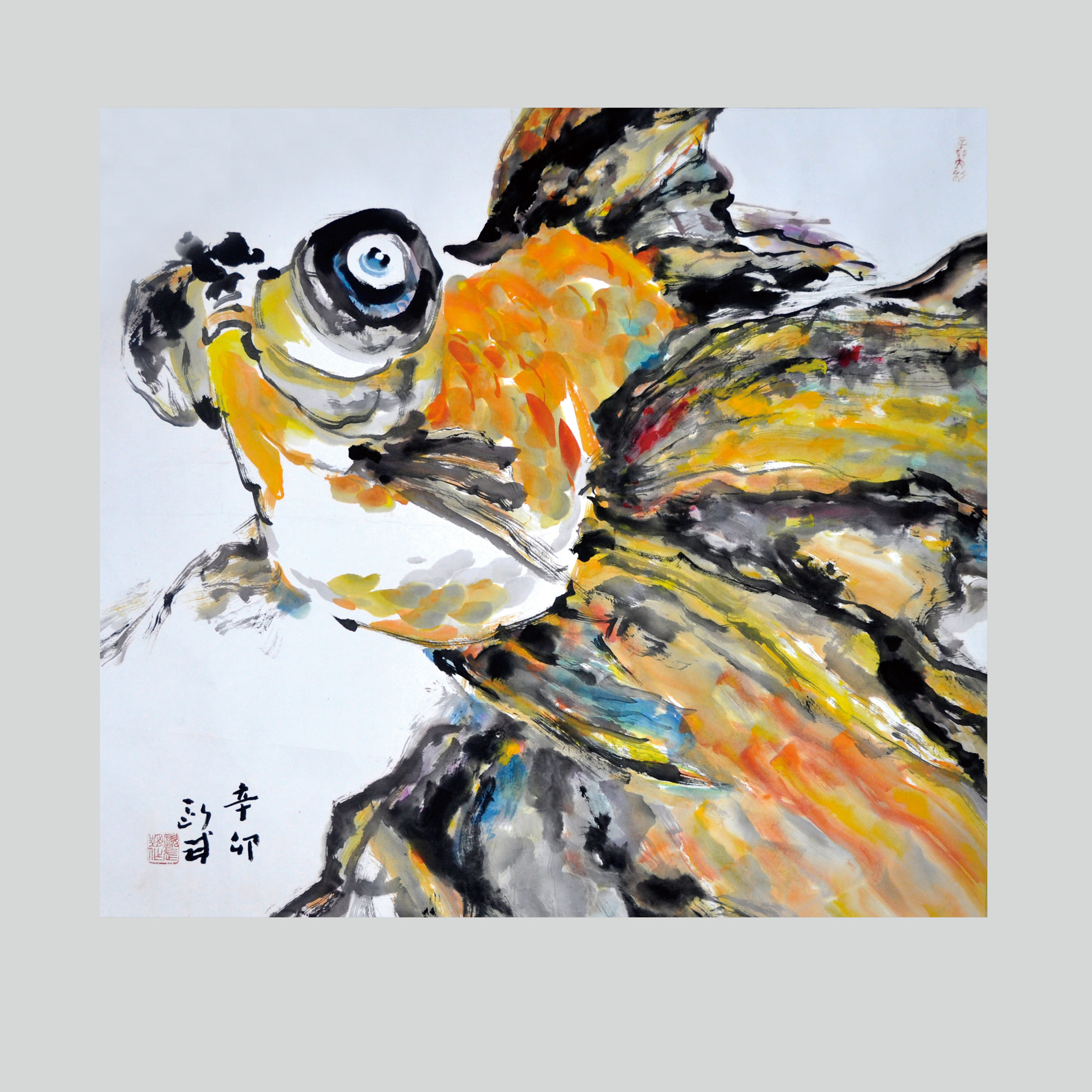 欧武是一位爱鱼之人,他不仅赋予鱼形体,还赋予其精神。不求具象的造型,而是用写意的手法表达鱼的性格。“金鱼”名字中带有美好的寓意,欧武用色彩鲜艳的笔触愈加地传达了这一美好主题。