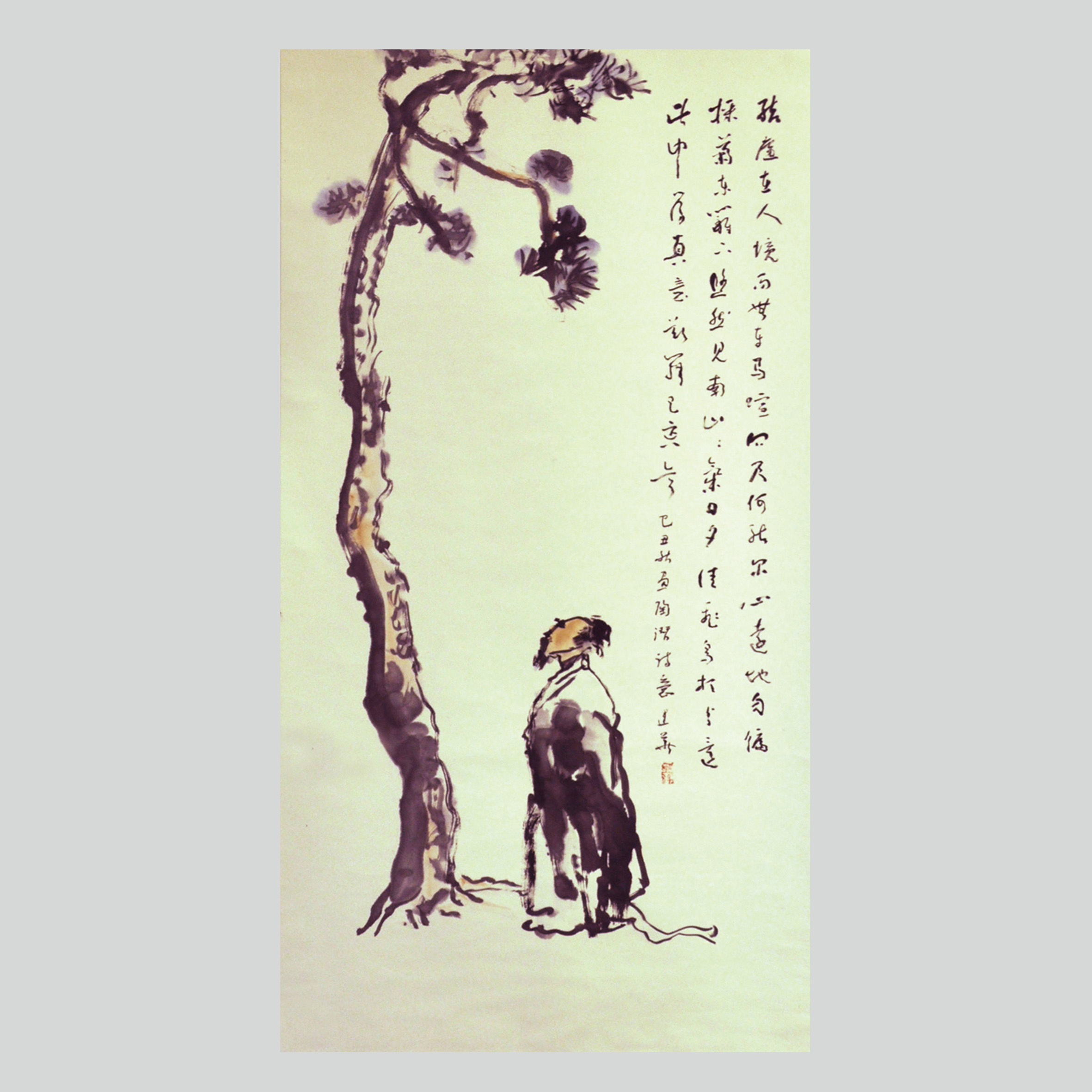 一树,一人,一诗,画面如此的宁静和开阔。“问君何能尔?心远地自偏”,在今天这样一个喧嚣的社会中,我们已经不可能像陶渊明时代那样隐居到山林里面去。我们在这个非常热闹的现实当中,只要我们每个人他的心远离一些名利、一些物质的追求、远离了一些世俗的官场,这样使自己的心变得非常的宁静,使我们获得更高的修养,这应该是陶渊明和裴建华共同的追求吧。