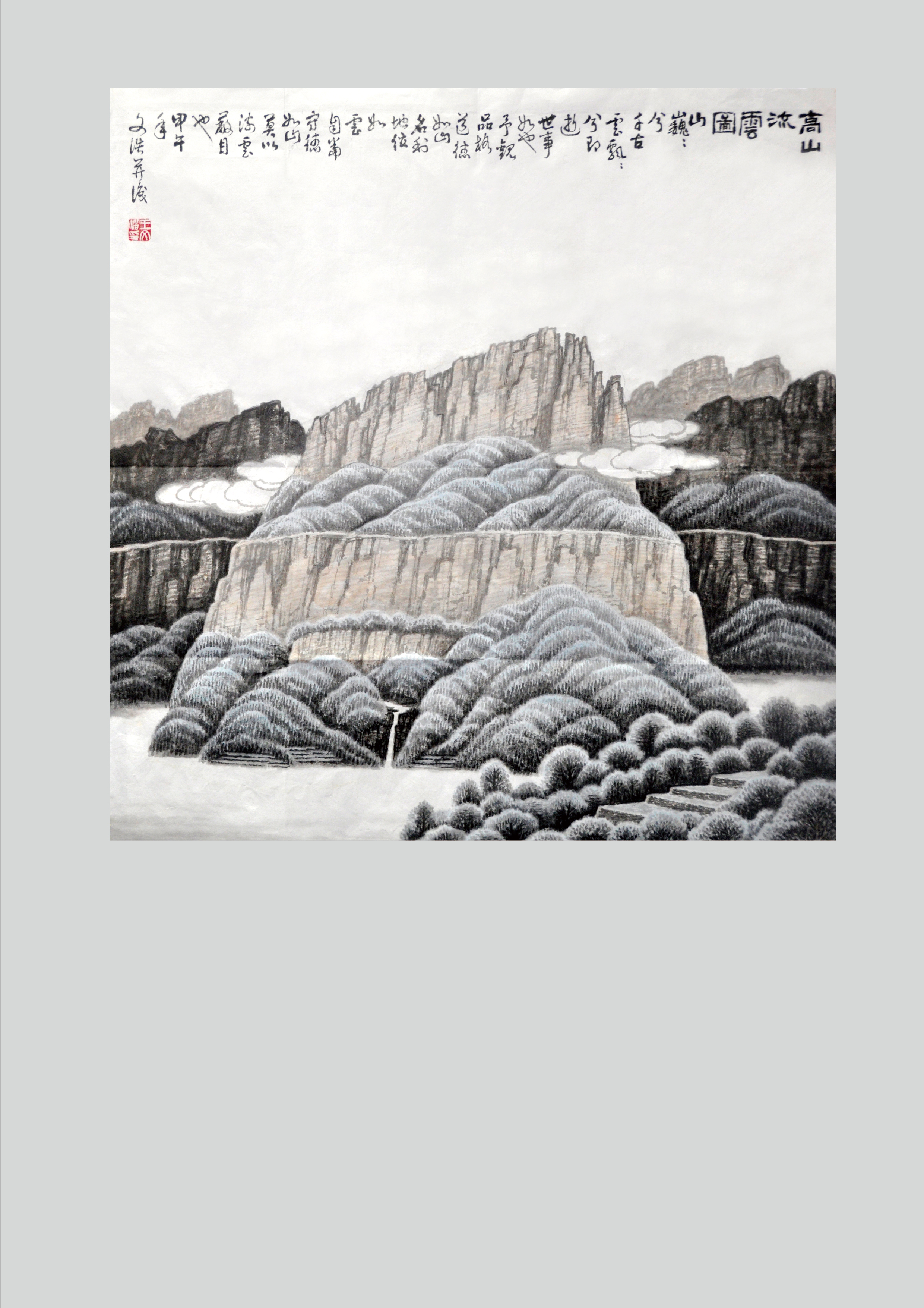 王文浩的这幅作品构图大气,具有很强的形式感,画面层次清晰,虚实关系恰当。在传统中国画笔墨基础上探索出新的画法,山石树木云彩的表现别具一格。画面厚重又不失灵气。细节表现充分,是一幅精品之作