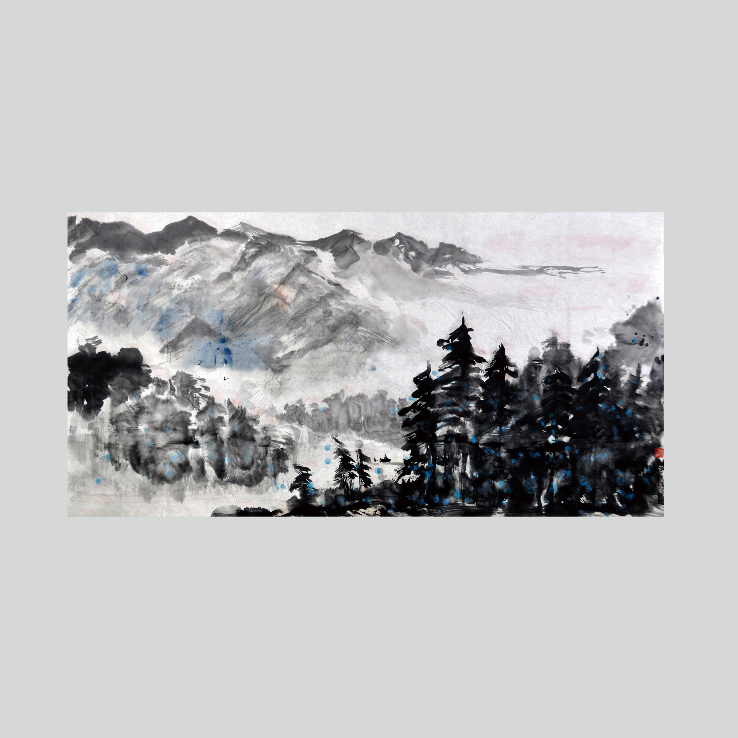 周文波善于发挥用笔效能,以笔触轻重急缓的变化来表现自然山川的不同变化。线条疏秀流畅,刚柔相济,尤善于表现烟波浩淼,云蒸雾霭的大自然景象。