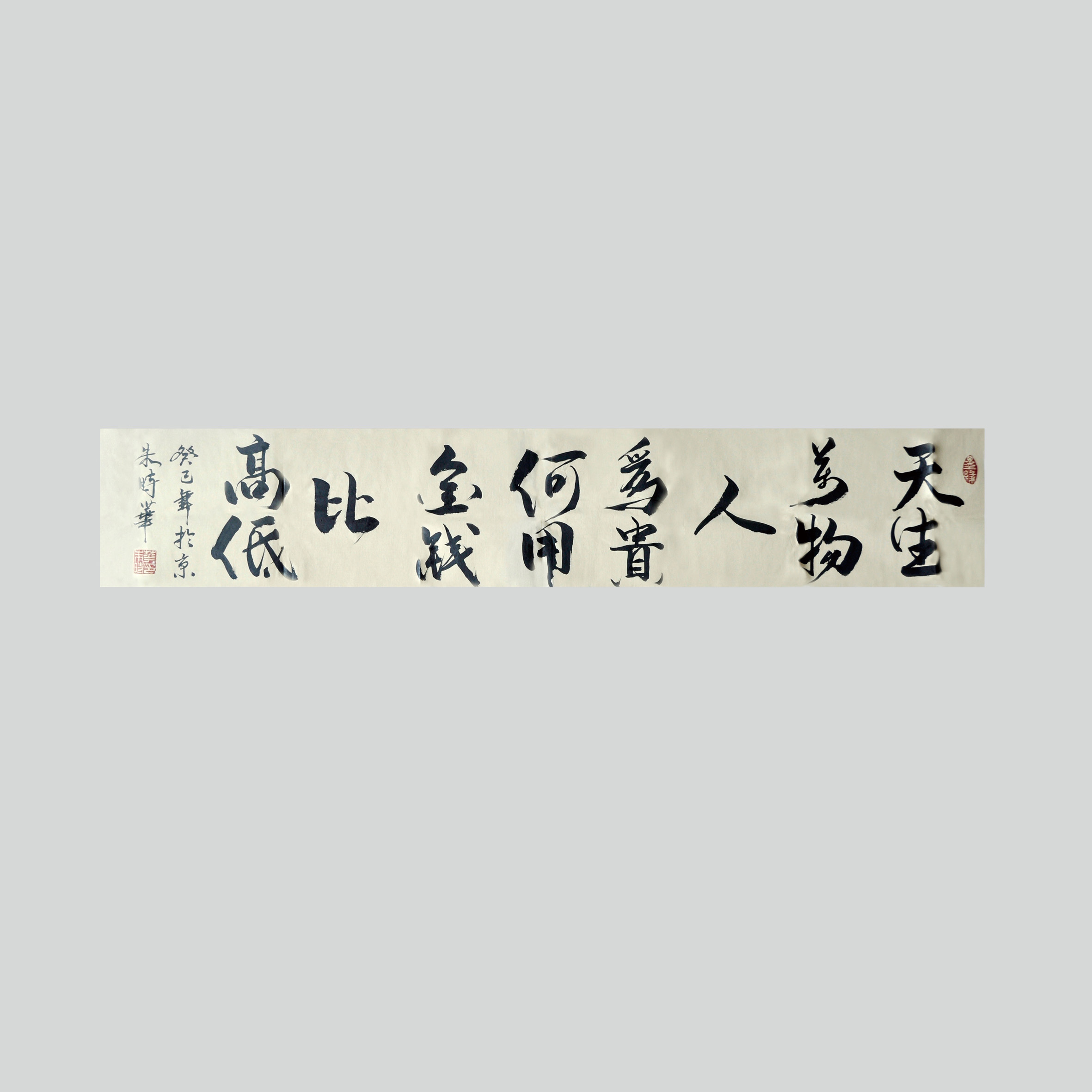 朱时华书法作品《天生万物》纵35cm,横138cm。整幅作品有如仗剑侠客,行走江湖,冷眼看世间。指天发问,问道问人。《老子》有云:“故道大,天大,地大,人亦大。域中有四大,而人居其一焉。”人为贵,因其为四大之一,四大之外不可与之相提并论。作品立意之高,以气韵带动书写,成此精品。