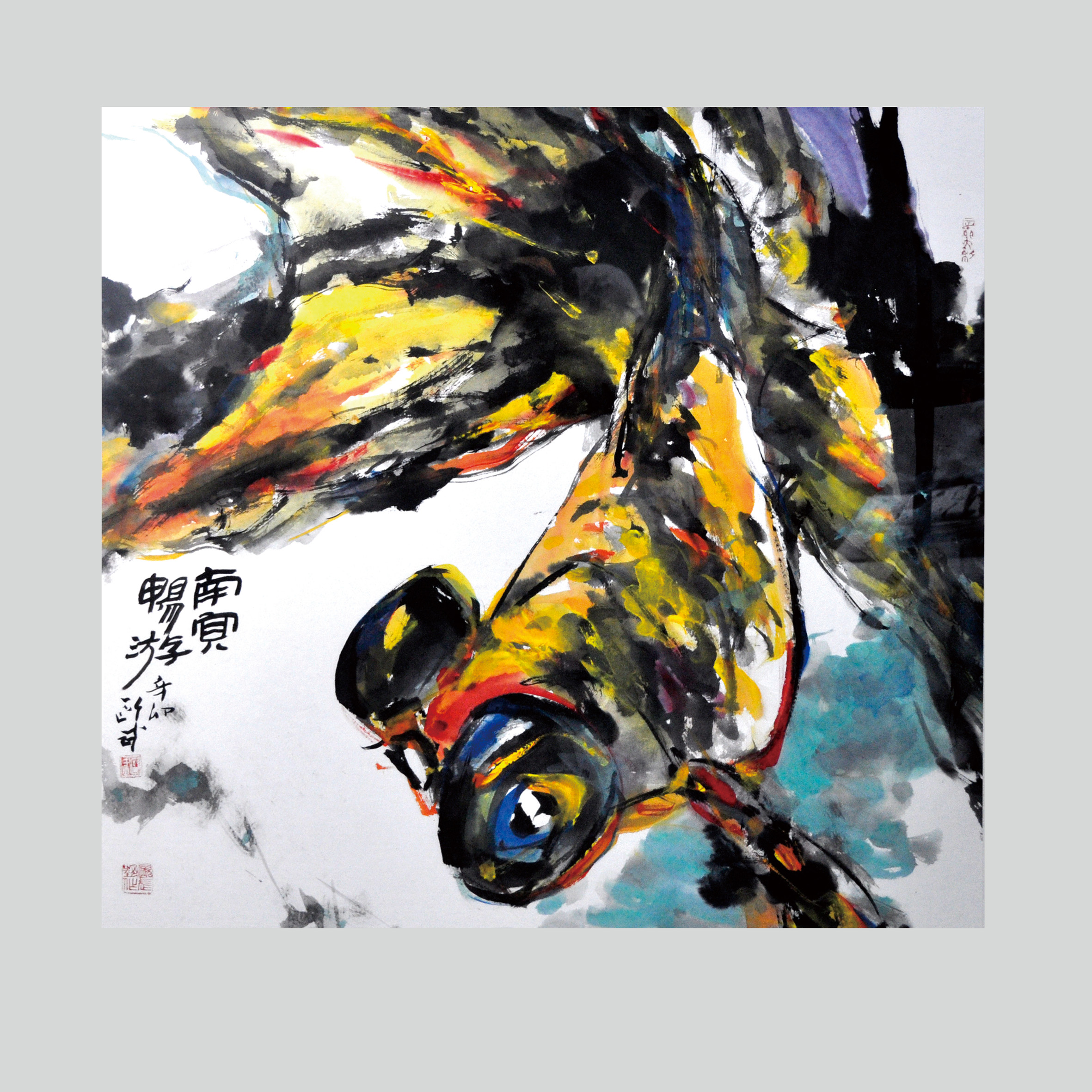 欧武对水有极强的控制力,不仅是指“水墨”中的水,也指画面中的水。在这幅作品中,鱼在水中游,画面无水却胜似有水,鱼儿游动的畅快和颜色的绚烂都使人感觉到水的清澈与清凉。