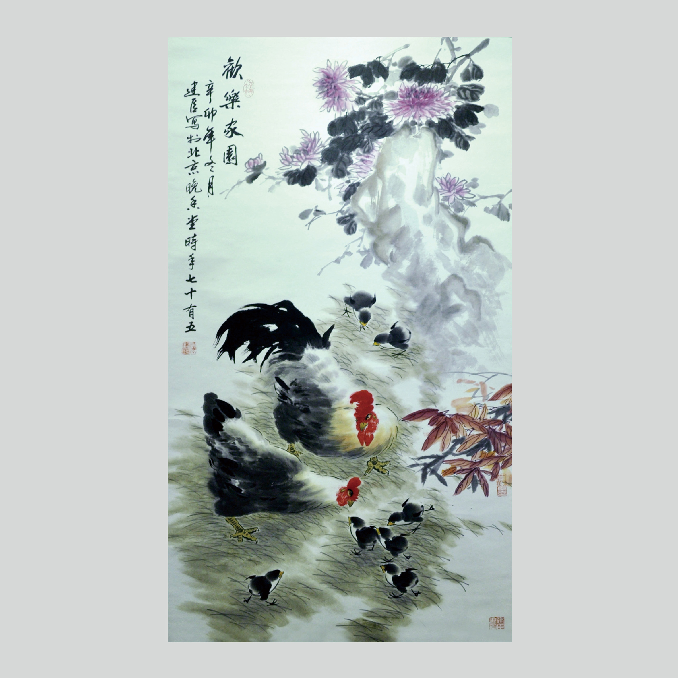 杨建臣笔下的鸡,雄赳赳、活泼向上,却没有霸气、匪气或怪气。画面上充满了和睦与和谐,洋溢着喜庆与幸福,这除了与他的笔墨技法相协调以外,还可以看出他一定是一位真心喜爱鸡的人,只有与内心情致互为表里的人,才能表达得如此自然生动。