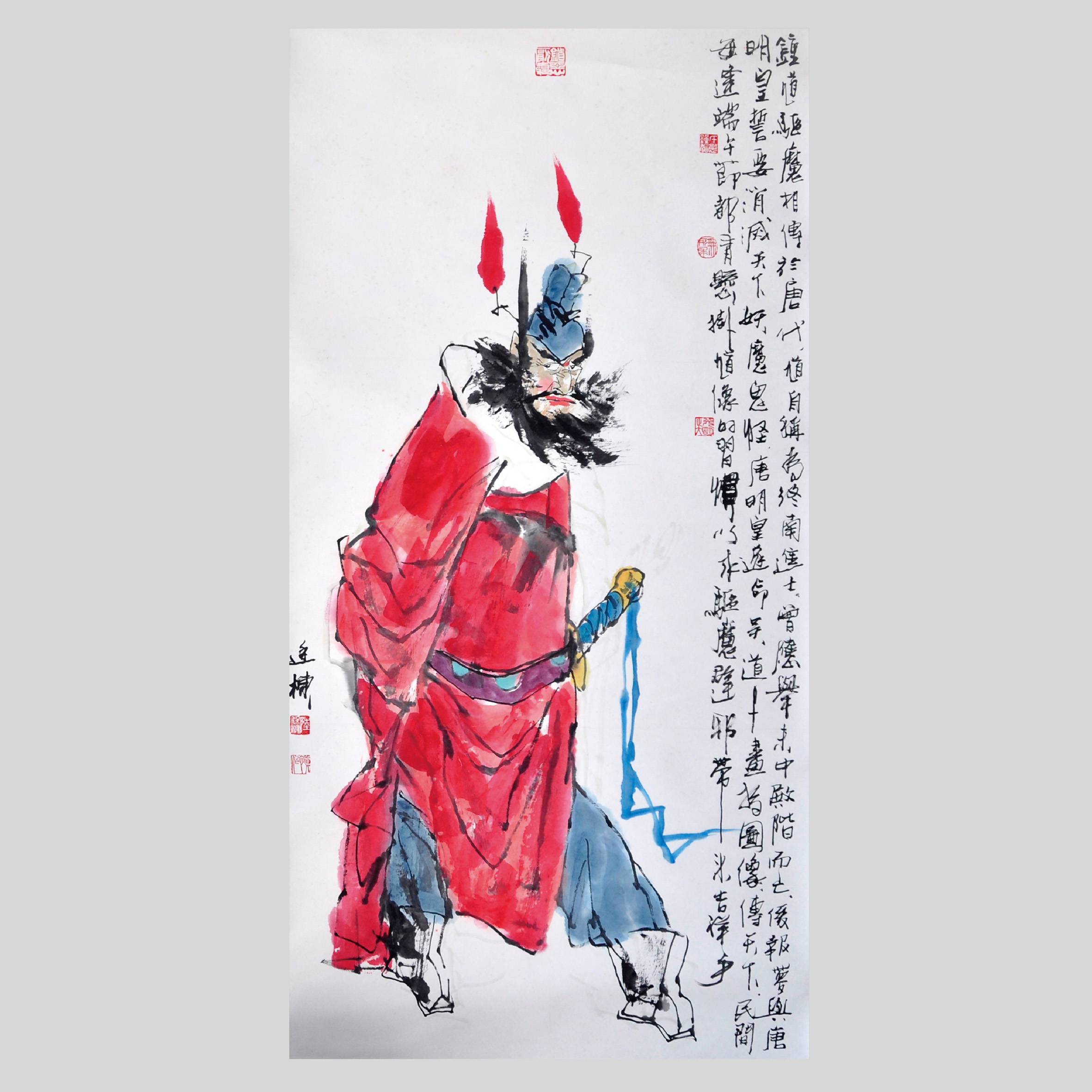 此幅书画作品为陆廷栋《钟馗》,整幅作品所画为佩剑的钟馗,线条与色彩搭配使人物形象丰满,将浓丽的色彩、工细的勾染和准确的造型融为一体,并赋予了钟馗诸多现代人格的魅力,动感非常强。