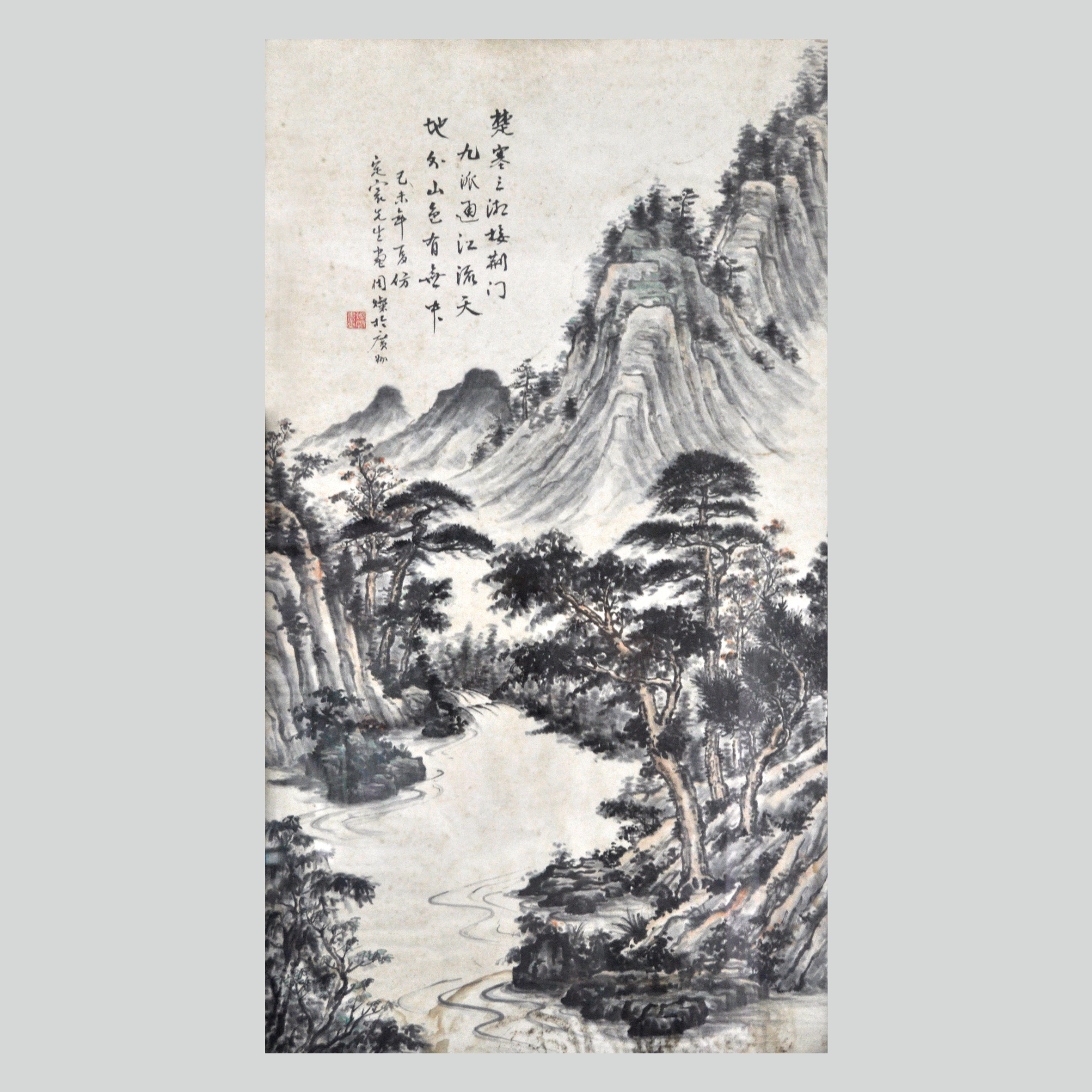 画中山石树木先以淡墨层层皴染,再施以浓墨逐层醒破。笔法稳健细谨,不恣意逞任,用墨浓淡相间,於满幅布局中有疏朗之感,故觉实中有虚。涧水轻柔,山色极为精采,可见作者深厚的功力。