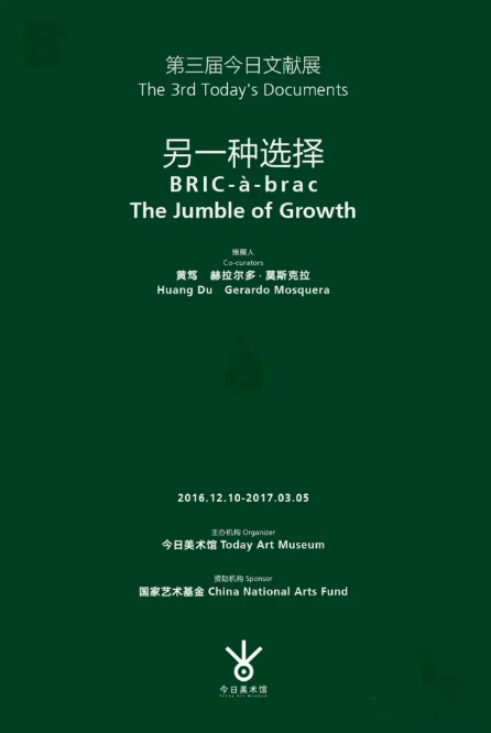 展览介绍: 第三届今日文献展将于2016年12月10日在1号馆和3号馆展出,本届今日文献展以“BRIC-à-brac”为主题(中文题目为“另一种选择”),将邀请来自中国、墨西哥、西班牙、巴西,印度,俄罗斯,南非,韩国等不同国家 地区的50位 组艺术家,探讨不同文化语境和发展形态下的艺术表现特征以及混合活力。