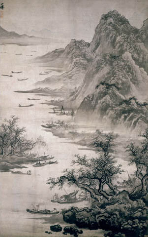 《渔乐图)又称《溪山渔艇图》,纸本,水墨画,纵270.8厘米,横173.5厘米,今藏北京故宫博物院。
