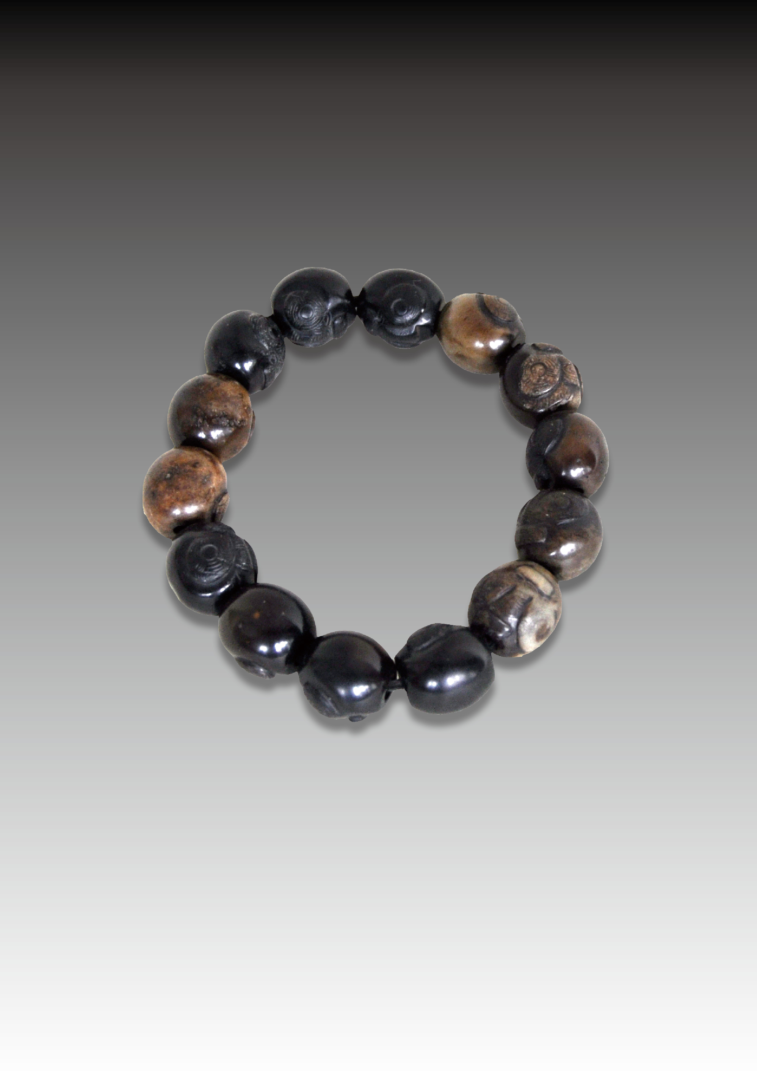 此串兽面纹玉珠手链,有十四颗,每一颗上都雕有精细的兽面纹,这种纹饰是出现比较早的一种玉器纹饰,在新时器时代晚期到战国时期的玉器上常见。手链制作精巧,境界神秘,是一件实用兼具美观的艺术品。