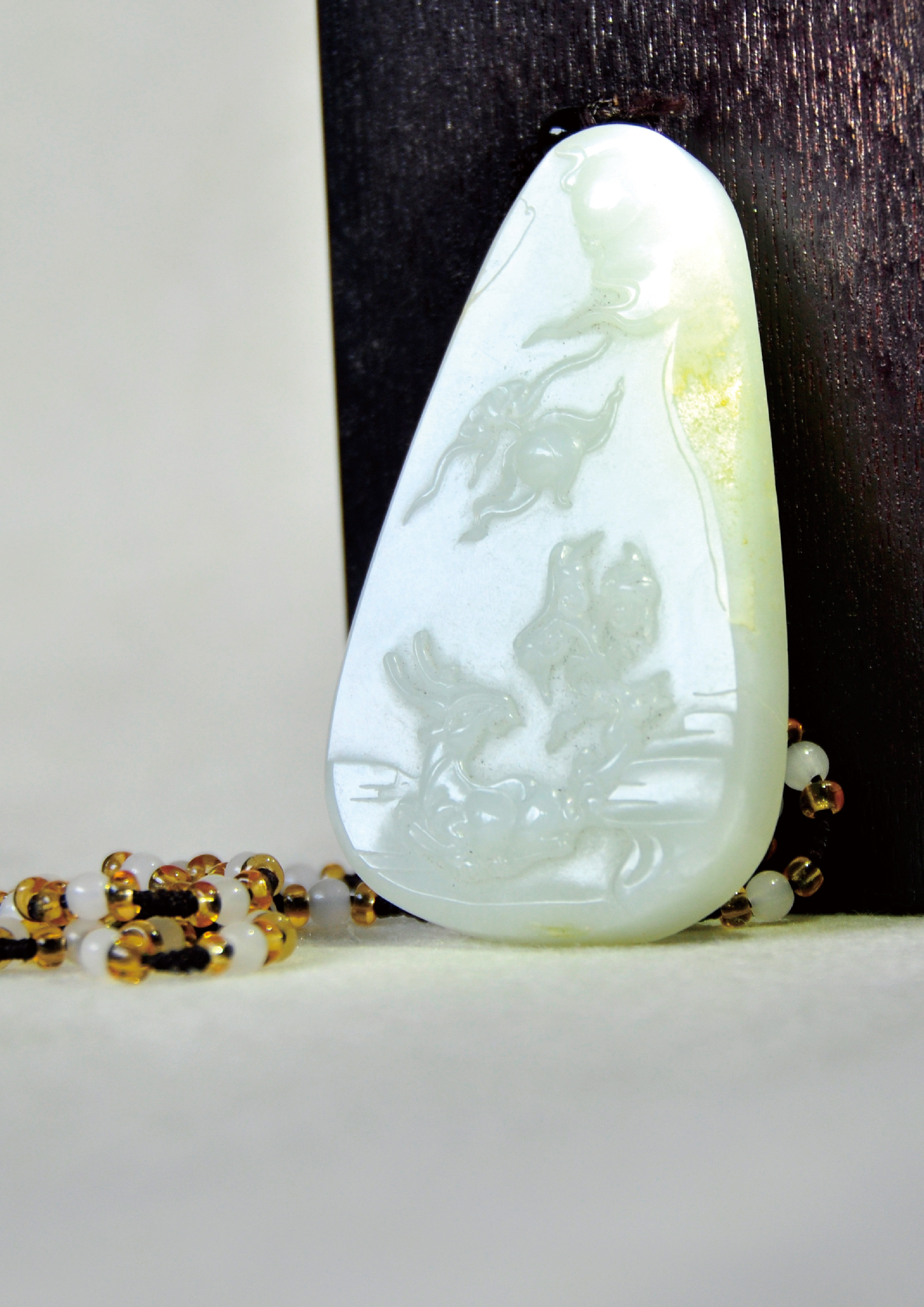 籽料挂件。玉质细腻,玉色自然,雕琢保留籽料原型,浮雕内容为象征福禄寿三物,画面感极强,表现生动。