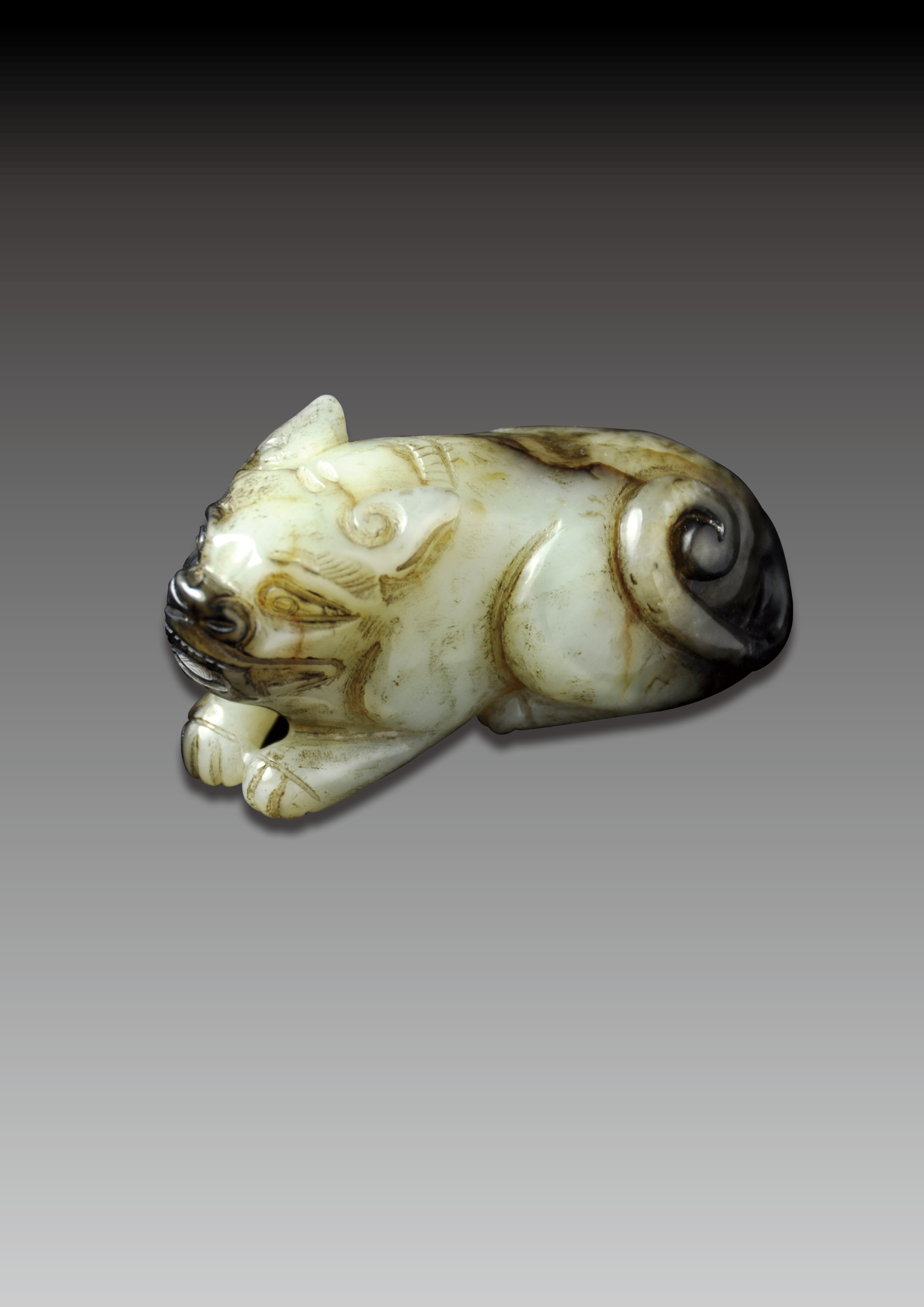 此件独山玉、形似野猪,玉猪内部云纹厚,包浆厚,硬度高,表面光洁,通透感较差,仔细观察玉体的黑沁是人工制作黑漆古,黑漆古亮丽,整体无损,保存完好。是明代人工做沁的典型。