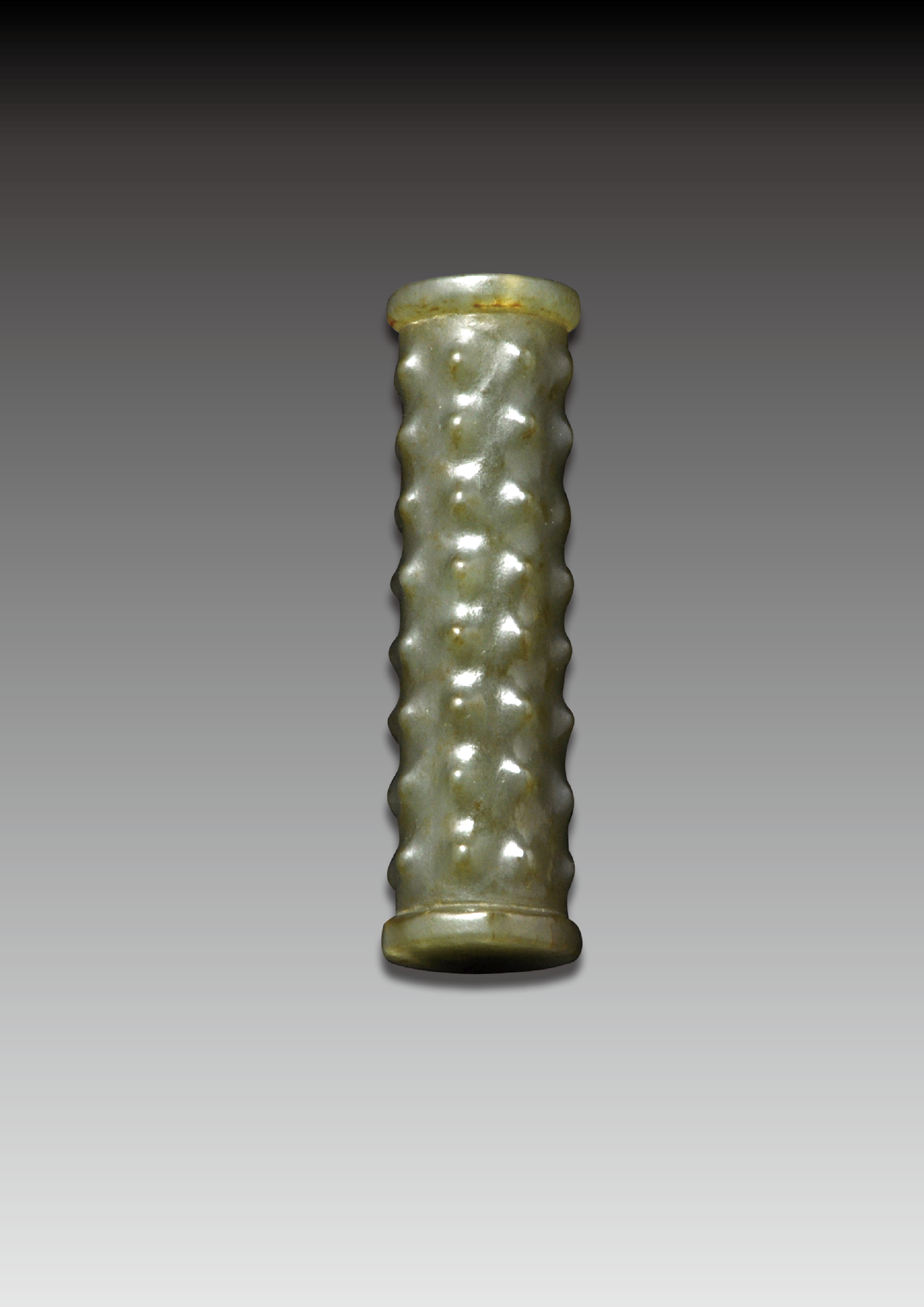 和田青白玉雕琢圆柱形,玉青中泛黄,乳丁纹装表,纹饰清晰,排列有序,圆柱体中间钻有一孔、是两头对钻而成。两端局部受褐色沁。沁色随绺裂纹加重,伴有过度层,整件器包浆浓厚,玉器件完整无缺损。是汉代用和田玉雕琢乳丁纹勒子。