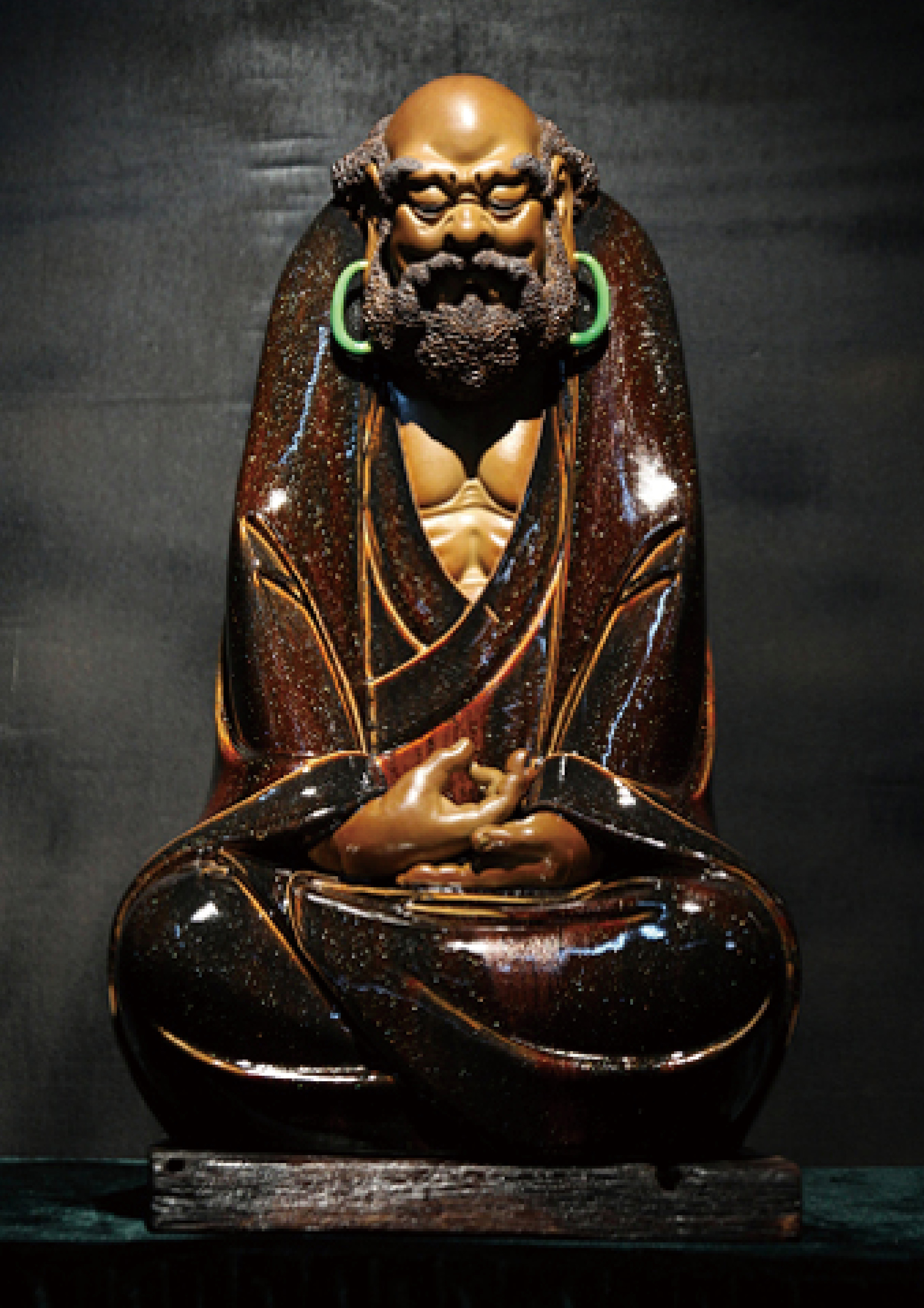 此件石湾陶“禅”为中国工艺美术大师杨锐华作品,高63cm,呈坐势,双目紧闭,神态肃穆,刻划的衣纹流转自如,折纹叠皱层次分明,富有质感。作品不仅成功地表现了达摩的神态,同时也反映了石湾窑制瓷匠师的高超技艺。