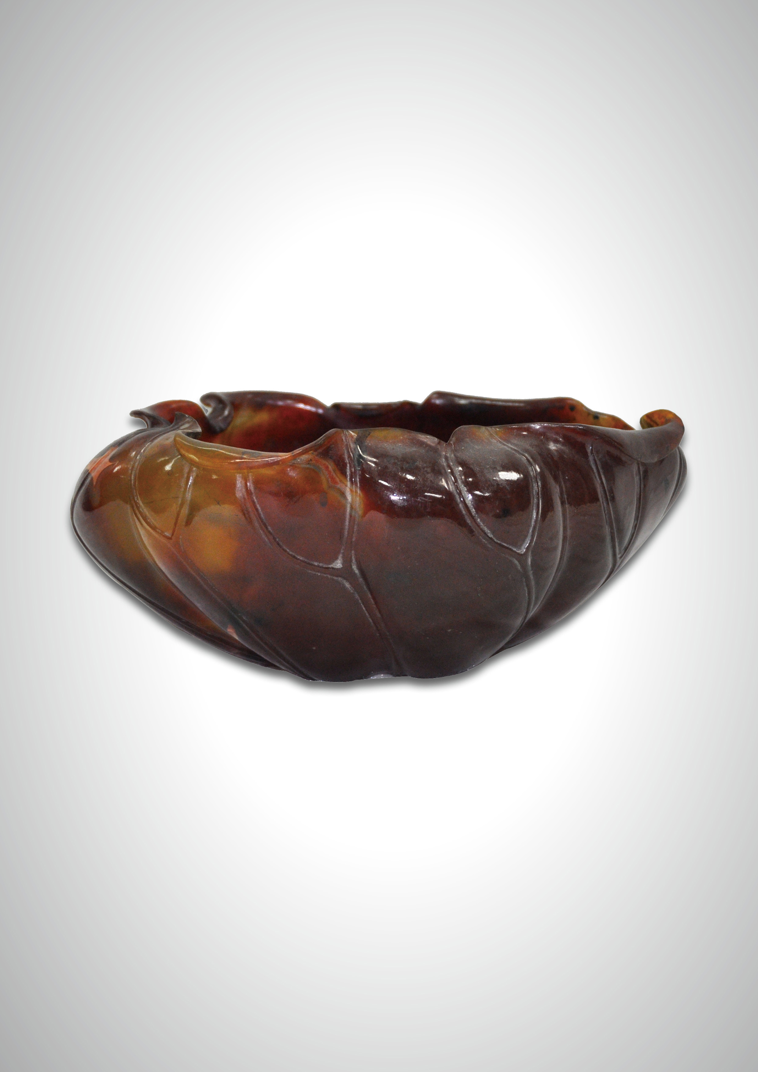 此件荷花叶造型的玛瑙笔洗,玛瑙质地温润通透,工艺讲究,包浆厚重。整体呈半透明状,表面平坦光滑,色泽鲜明光亮,显玻璃光泽,笔洗上所雕刻的荷叶纹饰细密精美,线条流畅,整个器形给人生动活泼之感。