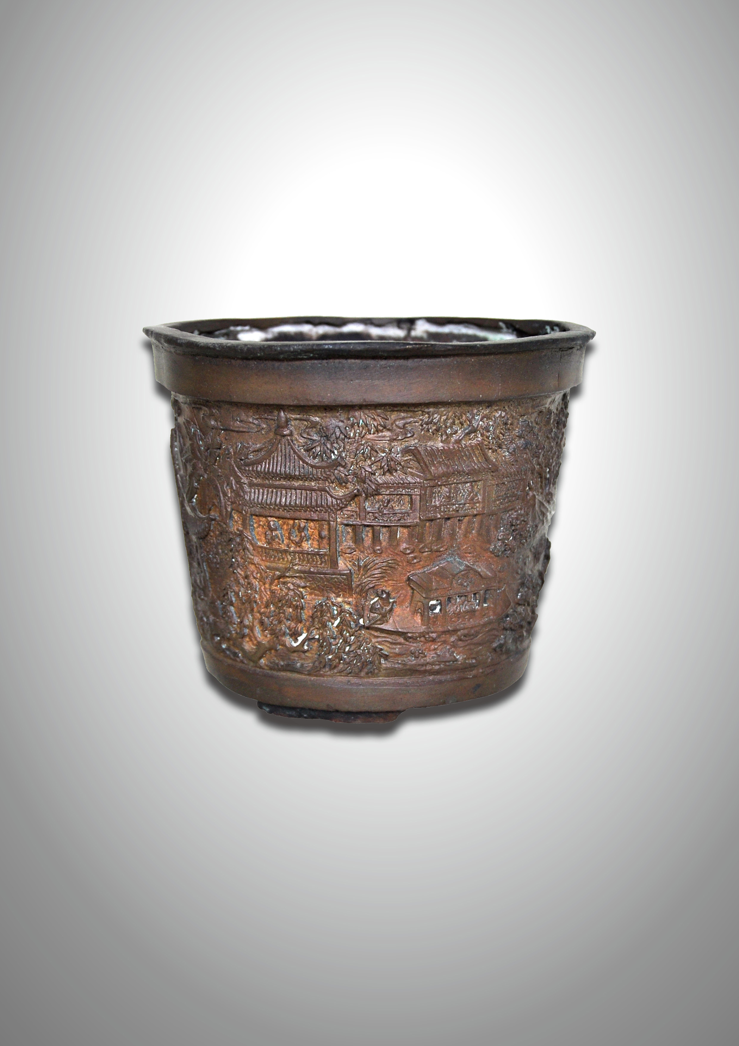此件为民国花卉铜盆。造型古朴,盆外壁用浮雕手法,所雕画面丰富,雕刻形象生动,盆底为三气孔,整体上美观与实用达到完美统一。
