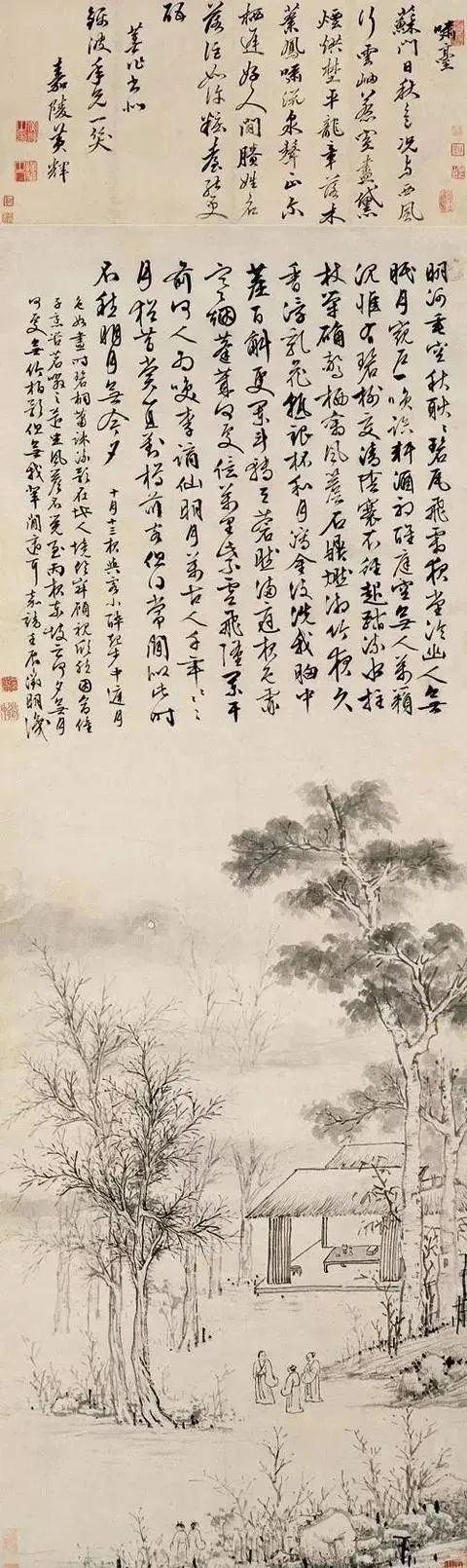 在中国传统绘画中,以文人月夜访谈为主题的创作并不少见,此图为代表作品之一。画面表现了画家与来客小醉后于秋天庭院中赏月话旧的雅会,寂静而明亮的月光,携无限情思,于画面之上浮现,并赋予中国画以新的图像内涵——与现实生活很近的亲切和悠闲。这也反映了当时士人高雅的生活情调,具有广泛的代表性。