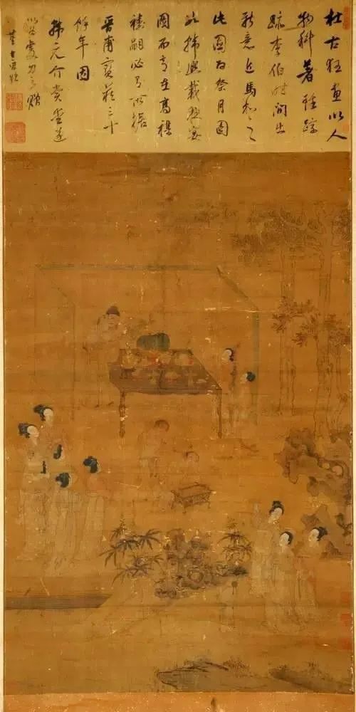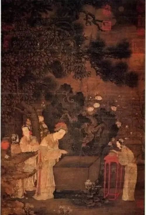 除“赏月”外,“拜月”亦是中秋时节宫廷与民间的重要习俗,从“秋分祭月”这一古老帝王祭祀活动演化而来——《周礼》言“圭璧以祀日月星辰”,即春天祭日、秋天祭月。至隋唐,盛行“拜月”风尚,宋代之后更具规模,明清时加入了功利性的世俗愿望。如今我国各地还遗存有许多“拜月坛”“拜月亭”“望月楼”等古迹。在民间,因月属阴,还有“男不拜月,女不祭灶”之说。这件绘画清晰地展现了中秋之夜女子“拜月”的情景——盛装妇人,手捧明珠,欠身欲取水涤珠;侍女或临案焚香,或捧奁,一派富丽祥和的景色。