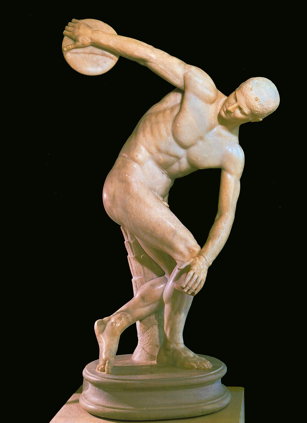 我们所熟知的奥运会就是从希腊发展而来,希腊人热爱运动,并把这种体育竞技与宗教崇拜相结合,比如运动员都以裸体参加比赛,用最纯洁的身体表达对神的敬意。赢得比赛冠军的人被看做是受神恩典的身体,有资格以他的身体为原型创作雕像。上图为希腊著名的雕塑家米隆的作品《掷铁饼者》,被公认为体育运动和健美体魄的象征。他一定是在铁饼比赛中得到冠军的人,才可以被最伟大的艺术家雕刻出他的身体。雕刻家以敏锐的观察抓住了掷铁饼者最用力的一瞬间动作,这是一个典型的瞬间。尽管在形体上是紧张的,可是整个雕像却给人以沉着平稳的感觉。而只要一瞬间,他那像弹簧似的形体就会立即伸直,而铁饼将从他手中飞向远方。同时掷铁饼者两只手臂的线条和他拖在后边的左大腿的线条联合形成了一个半圆形,其轮廓如同一只拉开的弓,腿和手臂联成一个图案,身体各部分的结构也体现一种肯定和稳固性。整个艺术形象健美而动人。