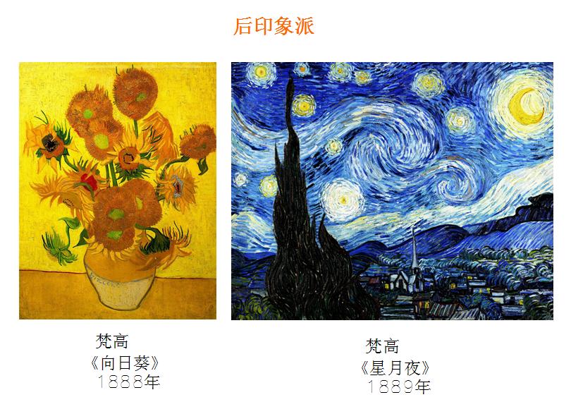梵高作品有最独特的个性和非凡的魅力,感情洋溢,他画的日常物品都具有极强的个性特征。他喜用夸张或简化的手法,削弱传统光影手法,有意识地强化色彩的价值,利用色彩的对比取得和谐,他用带着笔触的色彩线条描绘的物象,好似一个燃烧着的自然物象。 如《乡间夜路》、《向日葵》、《星夜》。