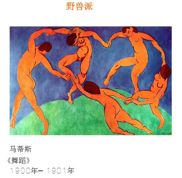 野兽派:用色鲜明强烈,笔触突出有力,对构图、题材、形体的处理带有主观随意性,画面大多具有装饰性。 代表人物马蒂斯。