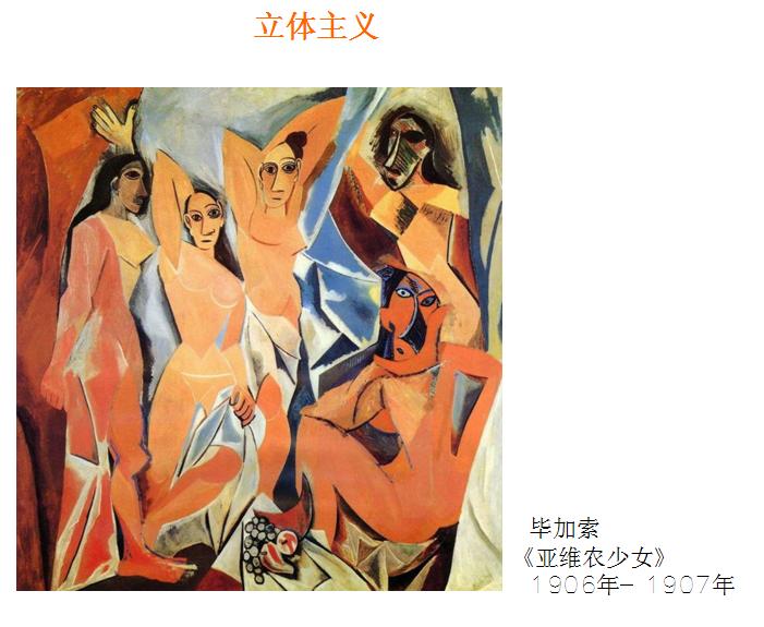 这幅画,可谓第一件立体主义的作品。画面左边的三个裸女形象,显然是古典型人体的生硬变形;而右边两个裸女那粗野、异常的面容及体态,则充满了原始艺术的野性特质。野兽派画家发现了非洲及大洋洲雕刻的原始魅力,并将它们介绍给毕加索。然而用原始艺术来摧毁古典审美的,是毕加索。在这幅画上,不仅是比例,就连人体有机的完整性和延续性,都遭到了否定。因而这幅画(正如一位评论家所述),“恰似一地打碎了的玻璃”。在这里,毕加索破坏了许多东西,可是,在这破坏的过程中他又获得了什么呢?当我们从第一眼见到此画的震惊中恢复过来,便开始发现,那种破坏却是相当地井井有条:所有的东西,无论是形象还是背景,都被分解为带角的几何块面。我们注意到,这些碎块并不是扁平的,它们由于被衬上阴影而具有了某种三度空间的感觉。我们并不总能确定它们是凹进去还是凸出来;它们看起来有的象实体的块面,有的则象是透明体的碎片。这些非同寻常的块面,使画面具有了某种完整性与连续性。