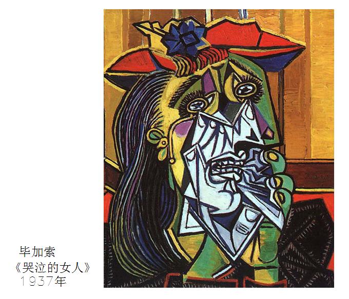毕加索仅以一些散乱而紧凑的线条、剧烈变化着的粗犷的颜色和挺直有力的笔触轻而易举地表现出来。女人的面部因无法控制的情绪而痉挛,悲愤的大眼和前额颠倒支离,眼睫毛是齿轮般的,眉毛是倒悬的锯齿般的,特别是那引人注目的嘴唇和牙齿之间凄凉的蓝白色域上,由于悲伤而破碎;她面色忽黄忽紫,浸透着墨绿的苦涩;她长着钢丝般的头发,头顶的帽子红得让人心焦;她用手撕着自己的脸,泪如雨注,声嘶力竭地放声大哭,哭得使人憋闷、心烦意乱。扭曲和断裂的,不只是一种线条的表现方式,更是极度痛苦的心灵。