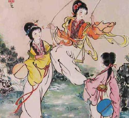 至隋唐时期,秋千已成为专供青年男女、少儿童子游戏玩耍之物,以练习轻捷矫健,促进感情,兼以锻炼胆识。打秋千之时,人在空中飘来荡去,翩然若仙,形似蝴蝶。尤其是女子,裙裳上下翻飞,衣饰、锦带、披皂、巾绶、步摇犹如藻井上的花瓣,随风齐舞,前后摇摆。恰似一池春水,碧波微蹙,红浪泛蕊。动则窈窕如燕,身轻若羽;爽约笑逐颜开,樱唇送雪。苗条之形影,乘云随鹤;纤丽之胸廓,铤而走险;华隆之装束,腾空却步;玲珑之腰身,雀跃生情。鬓发扬起,红裙追风,管袖漫卷,两腋清风,圆衣虽挝,足下春风。端是惹人喜爱,堪称妙丽无比。