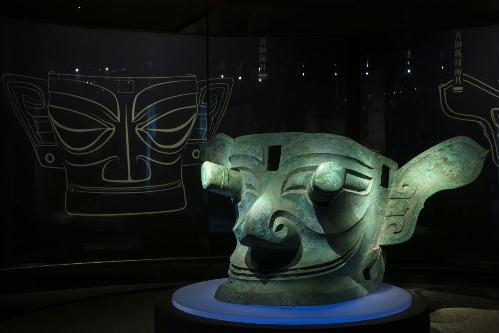 这是在位于四川省广汉市的三星堆博物馆拍摄的1986年出土于三星堆2号“祭祀坑”的青铜面具(3月5日摄)。该面具高72厘米,宽132厘米,是目前三星堆遗址出土所有面具中体量最大的一件。新华社记者 沈伯韩 摄