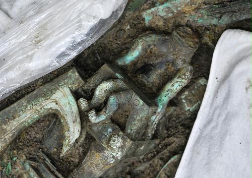 这是在三星堆遗址考古发掘现场3号“祭祀坑”内拍摄的具有人类形象特征的青铜器(3月19日摄)。新华社记者 李贺 摄