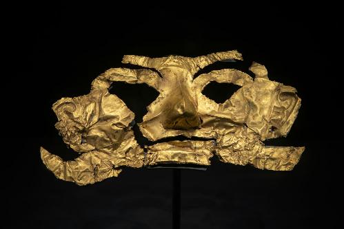 这是在位于四川省广汉市的三星堆博物馆拍摄的1986年出土于三星堆1号“祭祀坑”的金面罩(3月17日摄)。新华社记者 沈伯韩 摄