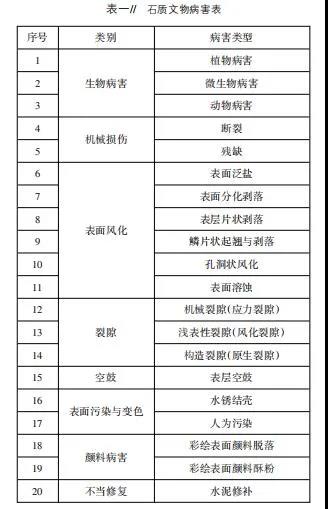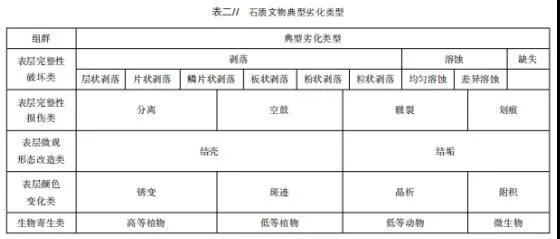 李宏松系统研究了石质文物病害的特征及评估方法,按照石质文物病害的现象及破坏形式,提出组群、典型类型、独立类型的三级分类分级体系,共界定了5个组群、17个典型劣化类型、8个独立类型,计25种病害类型(表二)。
