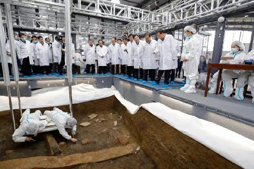 一座巨大的灰色钢结构“考古大棚”内,身着防护服的考古工作者在发掘坑内趴在悬空的操作台上,小心翼翼地工作着。4月19日,李克强来到四川广汉三星堆考古发掘现场。现场负责人介绍,三星堆此次考古发掘又有新的重大发现。总理认真听取情况介绍并仔细察看发掘现场后说,看到这么多学科的年轻学者,在今天这样一个快速发展的时代,仍然专注于考古事业,心还是静的,这很不容易。你们在现代社会发掘古代遗址,实际上是在发现和传承中华文化的根基。从早年的殷墟发掘,到二里头,再到今天三星堆的大面积发掘,你们要仔细比较、研究其中的关系。李克强说,考古技术发展到今天,已经不光局限于考古专业单一领域,而是许多学科协同配合的结果。要开放性利用现代科技手段,在发掘中进行新的探索、不断取得新的发现。考证文化根脉目的是为了鼎新,中华文明绵延数千年,通过考古使积淀深厚的优秀文化不断发扬光大。要发掘好、保护好、研究好三星堆遗址这笔丰厚的历史文化遗产。