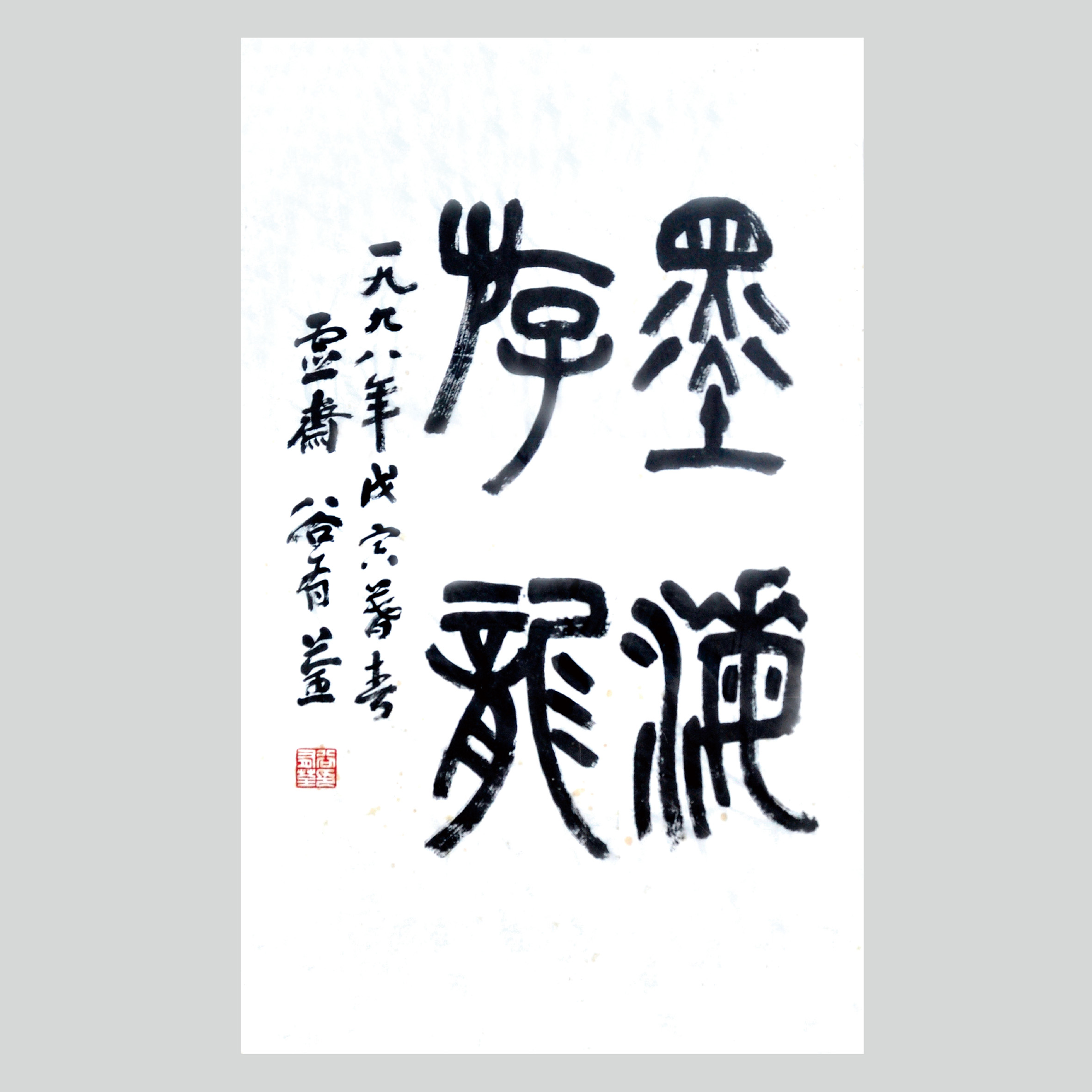 书法作品《墨海斿龙》,整幅字以篆书写“墨海游龙”四字,笔法仿古,苍劲有力,“遊”字无“辶”,暗喻龙行无痕。用墨干湿相宜,实为佳品。