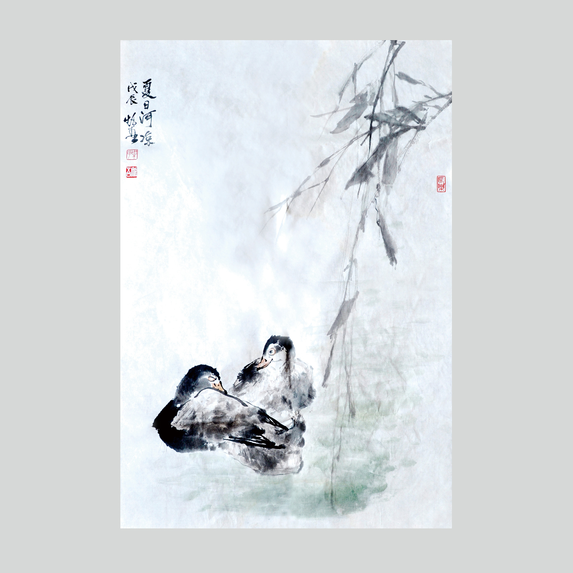 《夏日河凉》图,纵67.5cm,横47cm。柳之拂动,鸭之鸣叫,水之流淌,跃然纸上。夏日炎炎画中不直接表现,而侧以绿荫描绘,静中取动,乐趣盎然。河有凉意,鸭知水冷暖,透过水鸭之神态,可感河水之凉。柳叶摇曳,可感河风之凉。诸多景物合于画面,示人以清凉之感。