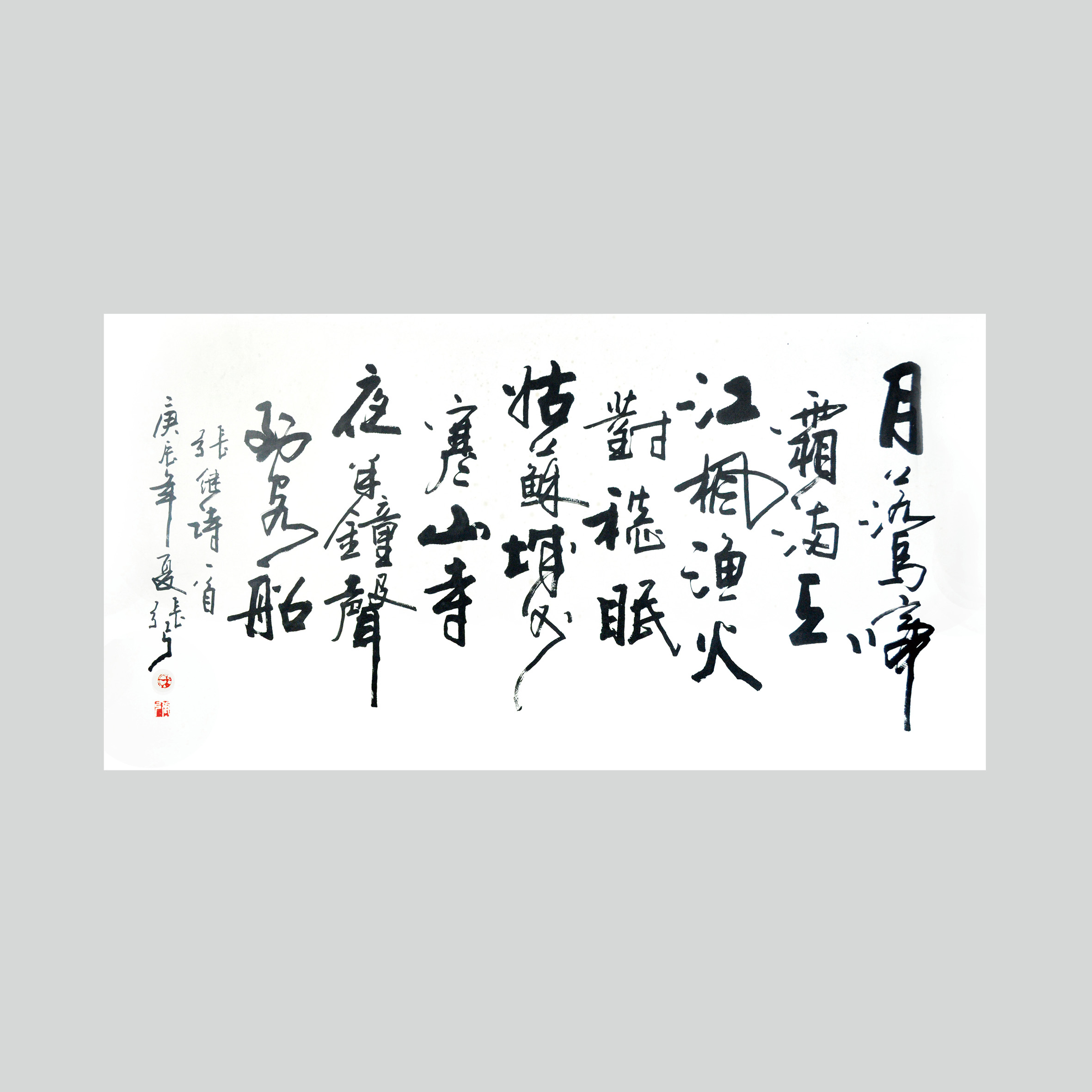 《张继诗》整幅作品纵67.5cm, 横135cm。节奏明快,却又韵律和谐。工整之余,暗藏变化。《枫桥夜泊》诗中遍景无人,满是愁绪。此幅字中月挂山的右上,“愁”字本是心载秋意,而作品巧妙将“心”藏秋中,画面引人入胜,并很好将愁绪浸染到整幅作品。