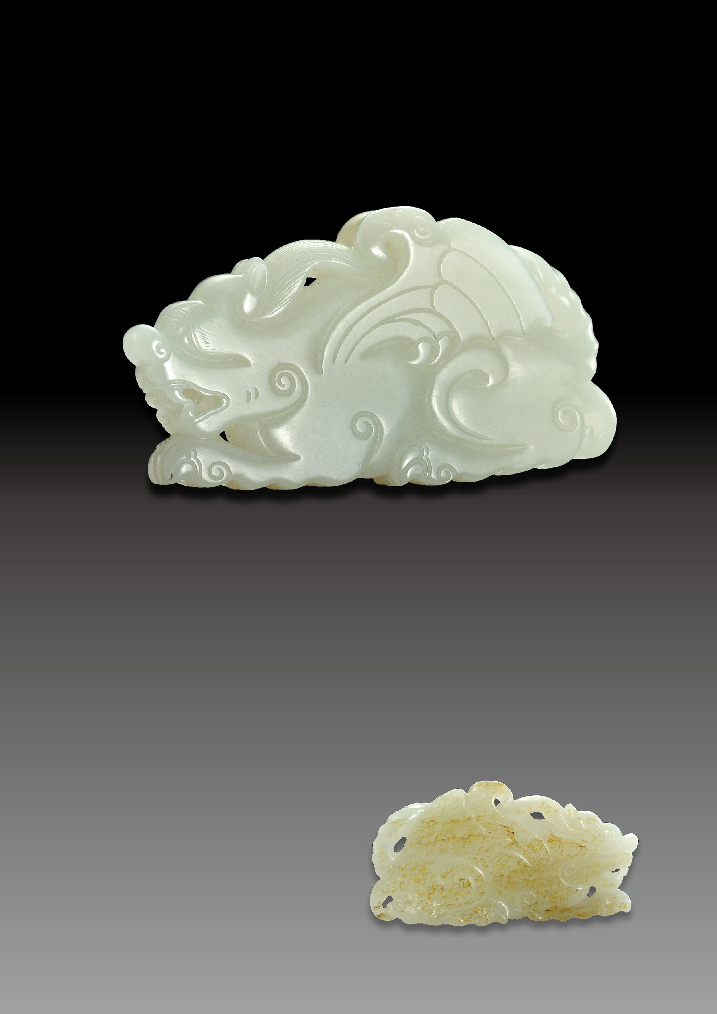 此件玉器选用和田玉雕琢而成。玉器整体光泽圆润,圆浮雕手法娴熟,线条细腻干净,层次分明,表现形象生动,卷曲线流畅如云,轮廓清晰,将仿古手法与现代审美有机结合,细节把握准确,达到了形似神圆的统一。