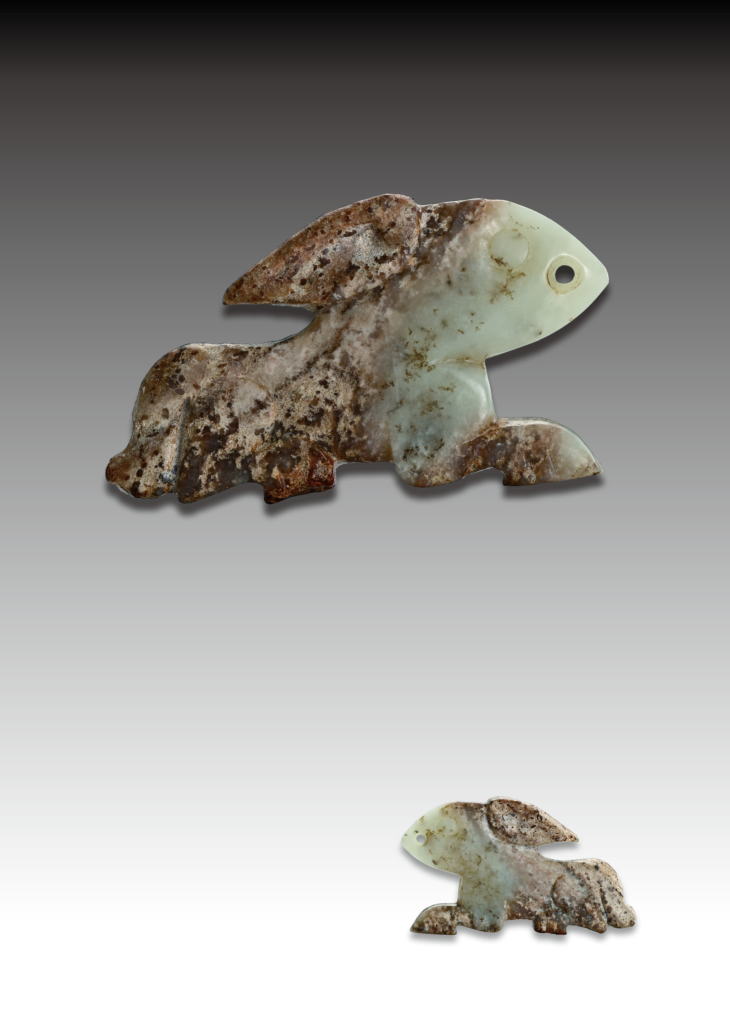 此兔玉色乳白泛青,有很重的沁斑和钙化。体形扁平,作卧伏状,首略昂,口微张,圆眼突显,大耳后竖,凹背翘臀,短尾上撅,前肢蜷曲撑地,后肢贴于腹部,形象写实。眼、耳、鼻、足结构均用粗阴线减地法刻出,头部钻一圆孔用于穿系佩挂。造型简练,线条流畅,比例协调,尤其长耳与短尾的着重表现形成明显对比,一种蓄势待发和机警灵敏的神态被刻画的活灵活现、跃然眼前,难得一见。