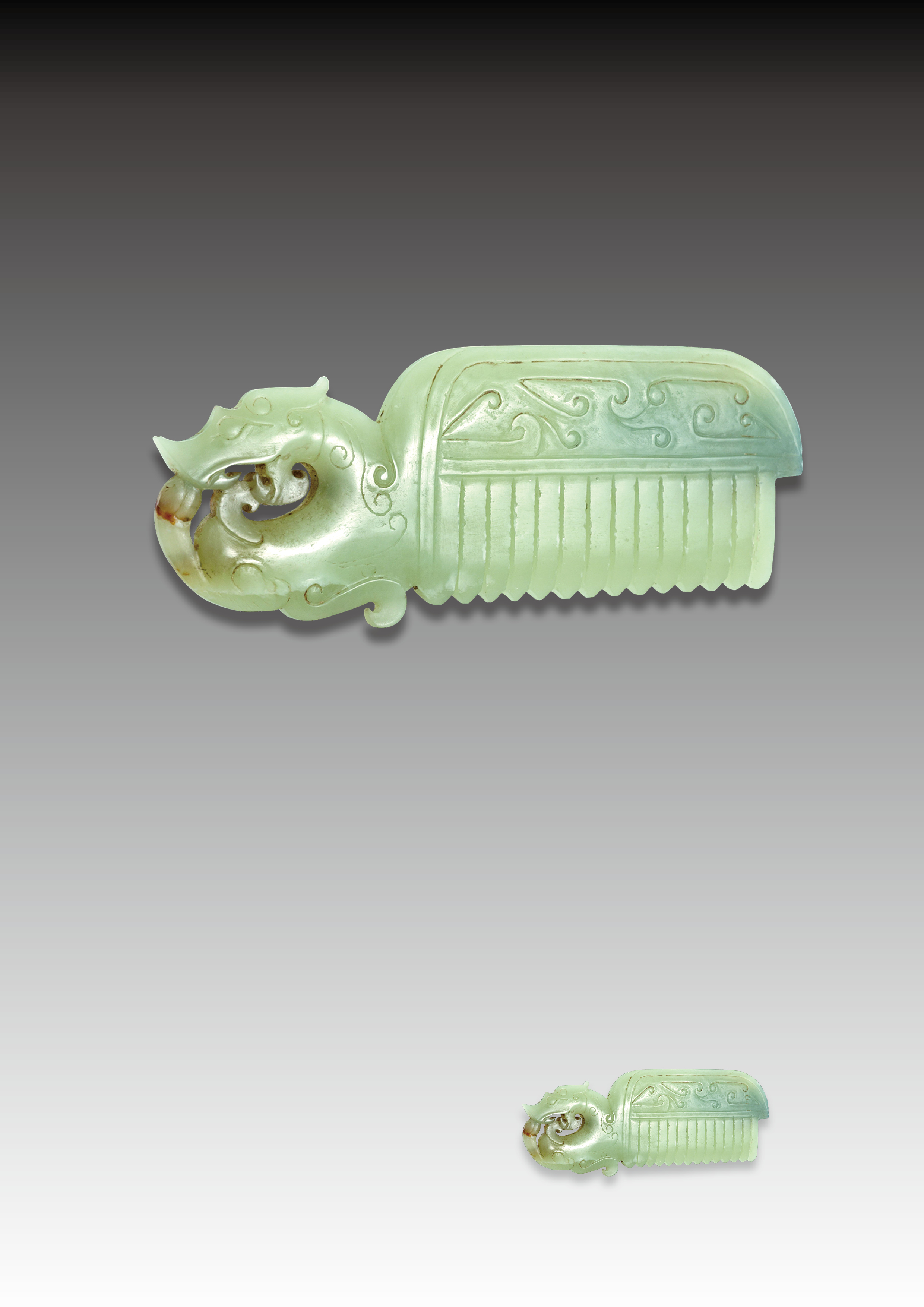 此玉梳篦是一件宋代玉匠用和田玉雕琢的玉梳篦。构思新颖,采用掏雕,镂空雕,减地法浮雕等雕刻技法,刀法简练,雕技精巧,沁色丰富,过渡有序,色泽和谐,古朴且厚重,梳篦龙头雕琢大气,神形自然。