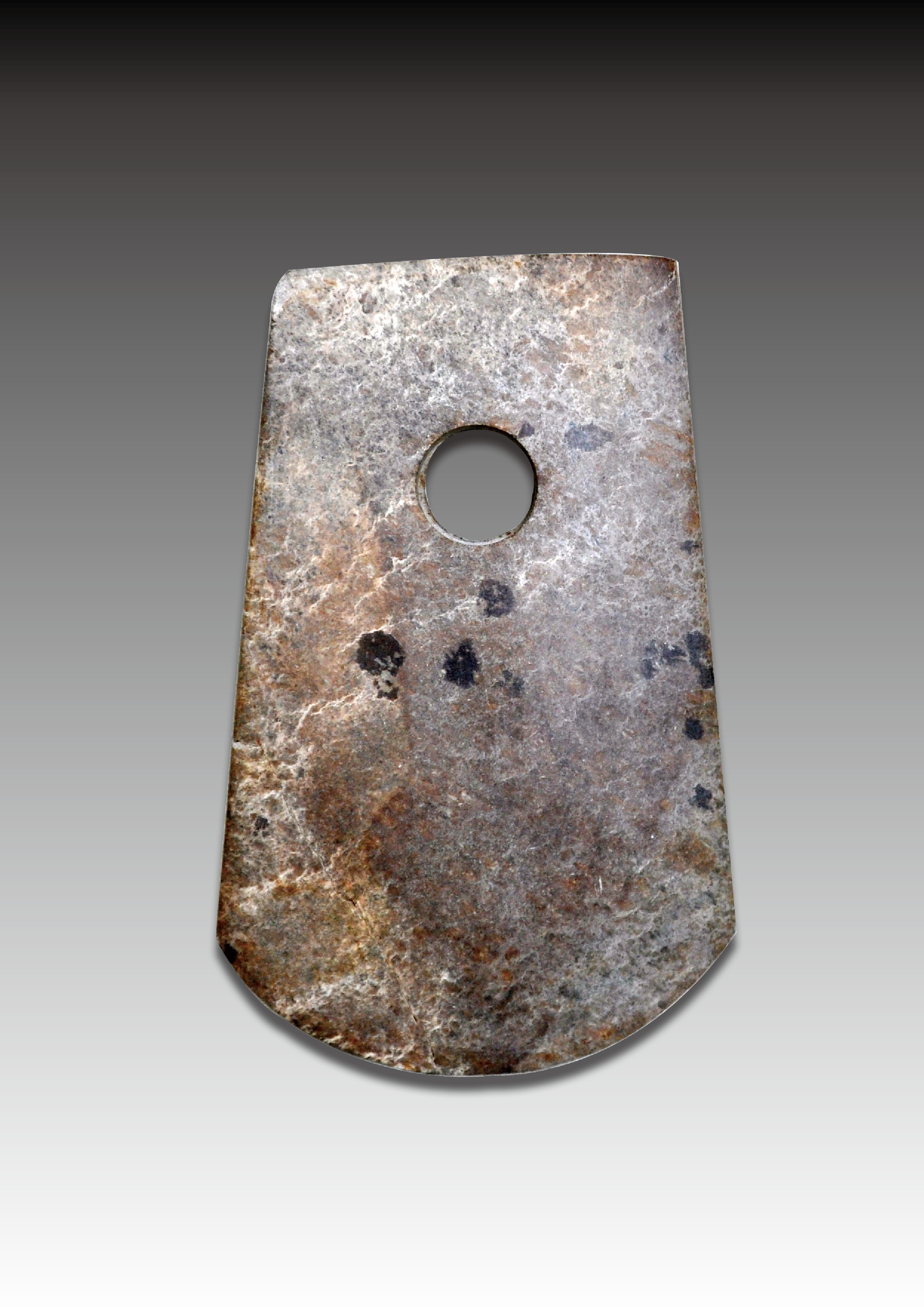 这件石钺为扁平长方形,双面刃略宽,刃缘微呈弧形,背端中部穿单孔。器形规整,磨制精细。钺是一种大斧形器具,由实用工具石斧演变而来。斧、钺在形制上相似,区别在于钺的刃部比斧宽阔,弧曲度更大,刃端两角微微上翘,有的还接近半月形的样式。由于石钺器身扁平,刃部宽阔,显然不太适合砍伐林木或用于农作,表明它已经作为一种专用兵器从一般工具中分离出来, 在古代战争中发挥着重要作用。 钺与斧相比,更显威猛刚烈,因此经常被视为力量与霸主地位的象征。