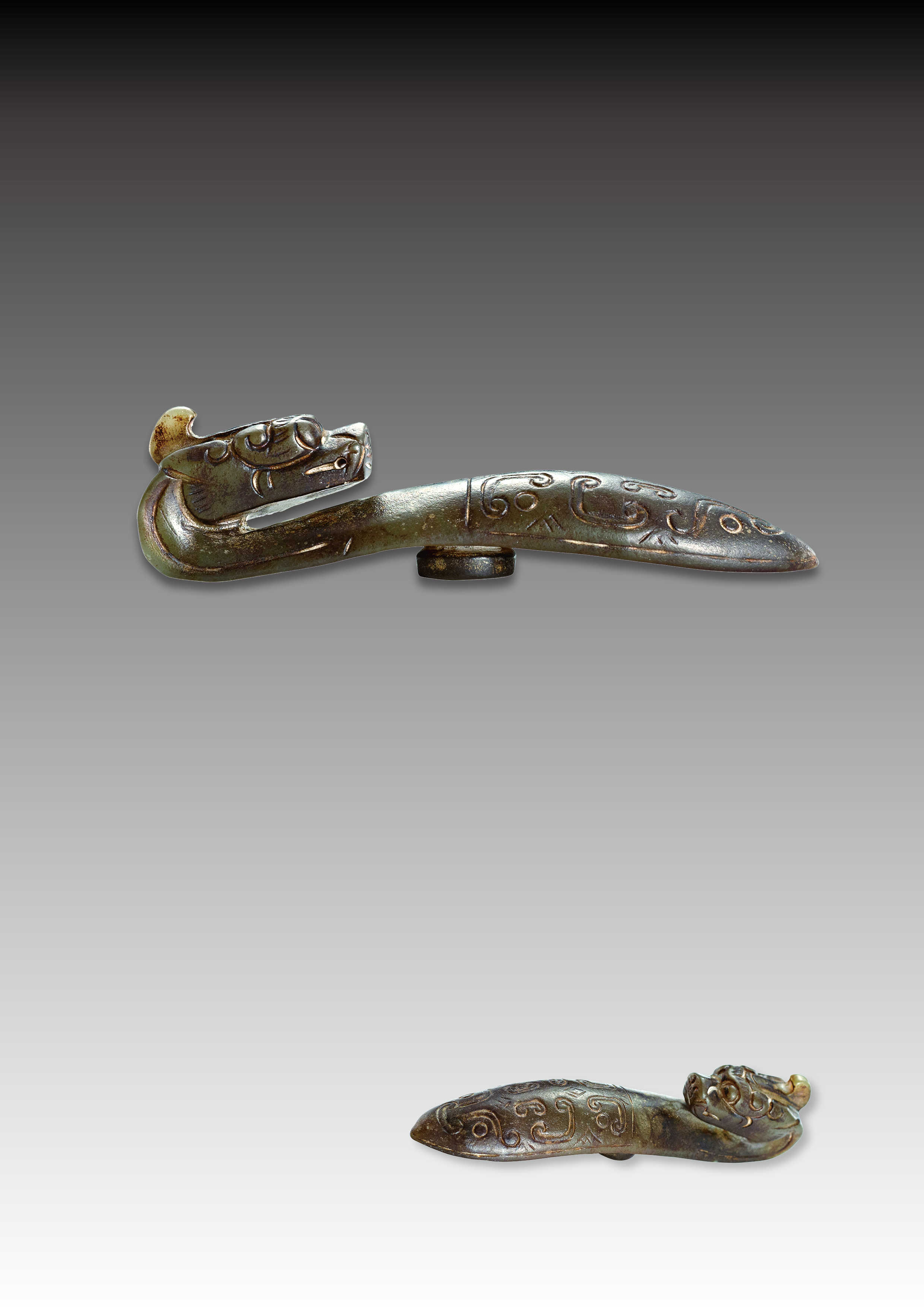 此件玉带钩为宋代器物,带钩为黄玉,玉质细腻润泽,器作长条倒钩形,形体是前圆平,前挺后弯,钩首作龙状,弯曲处带一长方形扣钮,整器造型优美,简洁流畅,做工精巧。