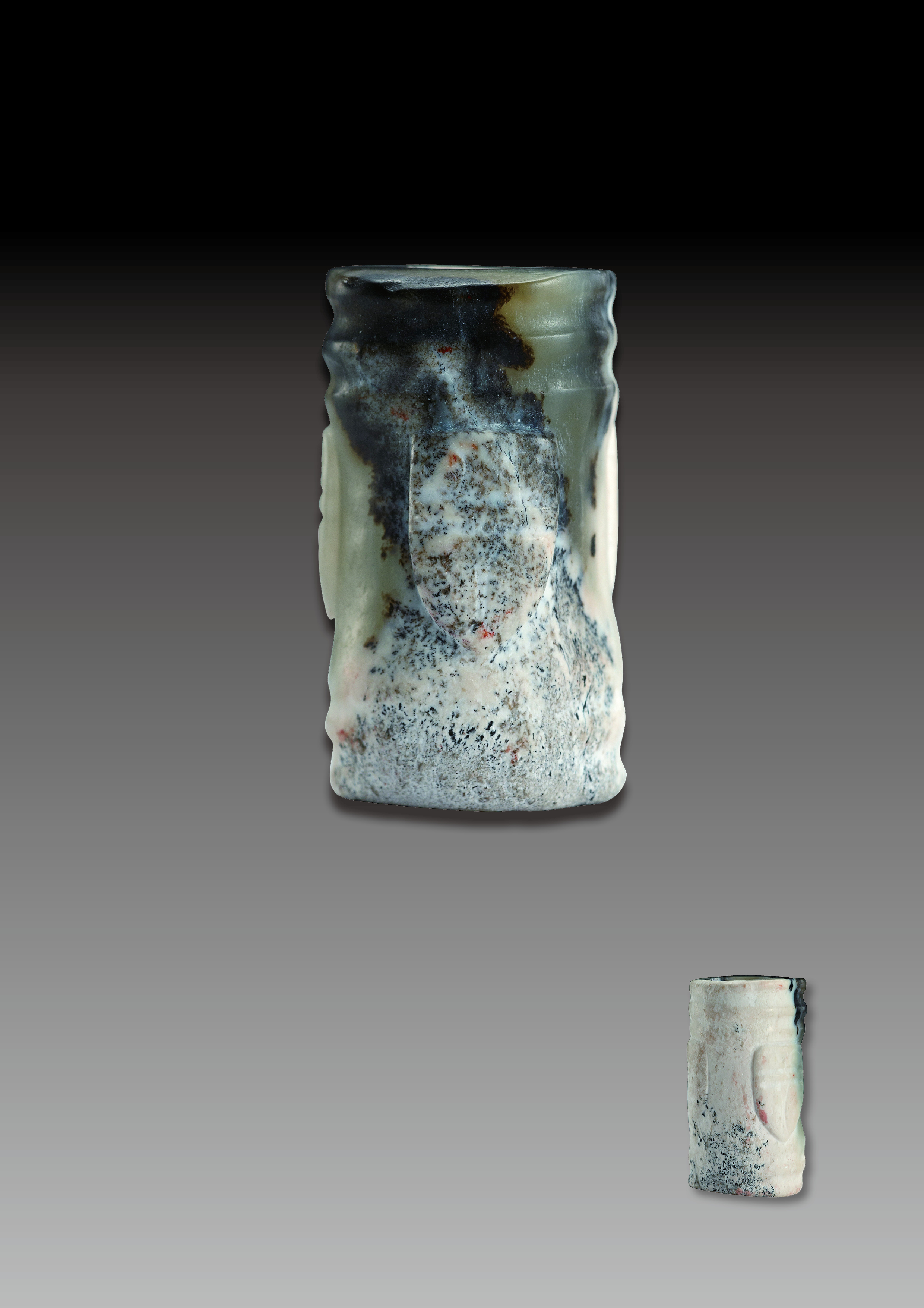 此件和田玉勒子玉质温润,包浆自然,器体局部受沁。玉器做工规整精良,琢磨精细,刀法为典型的殷商去阴留阳线技法,纹线刻划不深,刀痕浅圆。勒子源于初始并非玉石玛瑙,后发展为更加耐用的石玉材料,直至成为饰品等等。也称“蜡子”,文记主用“勒”字底下加个“玉”字旁,即“勒玉”,有圆柱形、扁圆柱形、束腰形、橄榄形等等,是挂于胸前或腰间的玉饰,可单独挂,也可与其他玉饰组合挂。
