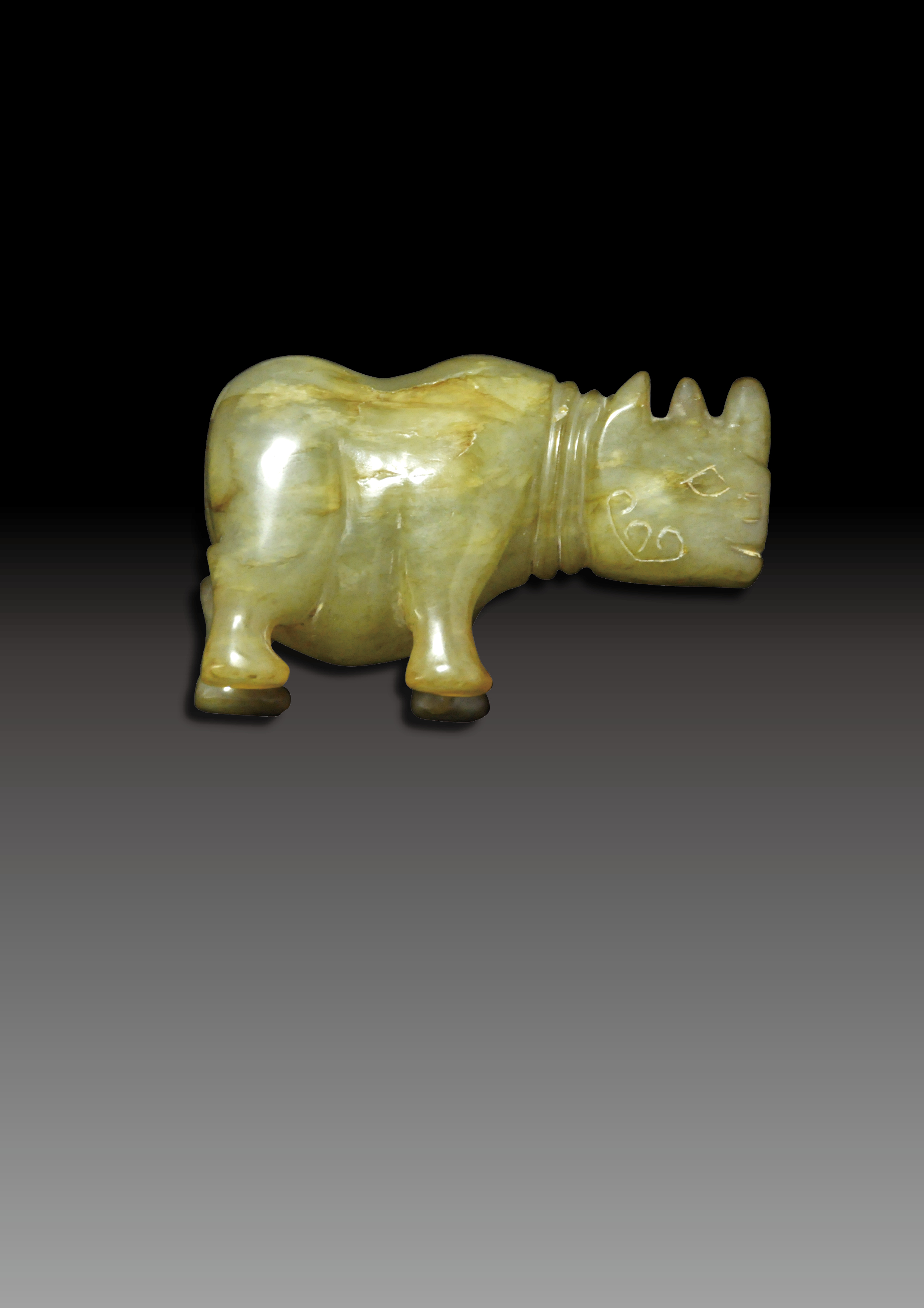 青黄玉,玉呈黄褐色及轻度氧化白斑。隆鼻小耳,耳蜗内陷。耳下有两圈阴斜线将头部与身体界开。龇牙,瞪目,探首前视,塌腰耸臀。短尾。四足直立。是元代雕琢的‘圆雕’手把件。当时中国已不产犀牛,由玉犀牛的出现可以推知中国当时与域外地区有密切的物质交往。犀牛在古代是吉祥动物,被视作伏魔压邪、驱灾避祸的神兽,因而玉犀牛成为人们祈求平安、赐福家园的最佳摆件。西周时期的圆雕动物类玉作极少。战国时期的玉犀牛,器形较大,制作精美。体多扁平,均有穿孔。形作垂首,张口露牙,嘴上与额下有一或二只短尖角,梳形目,四爪足,长卷尾,周身饰纹。大多是单个为器,少数作双犀并体璜形。此期玉犀牛虽较少,但有一些神异动物玉器,如龙、螭、虎和辟邪等,其形式都或多或少有犀牛的身形特征,可知当时的犀牛有重要的地位。
