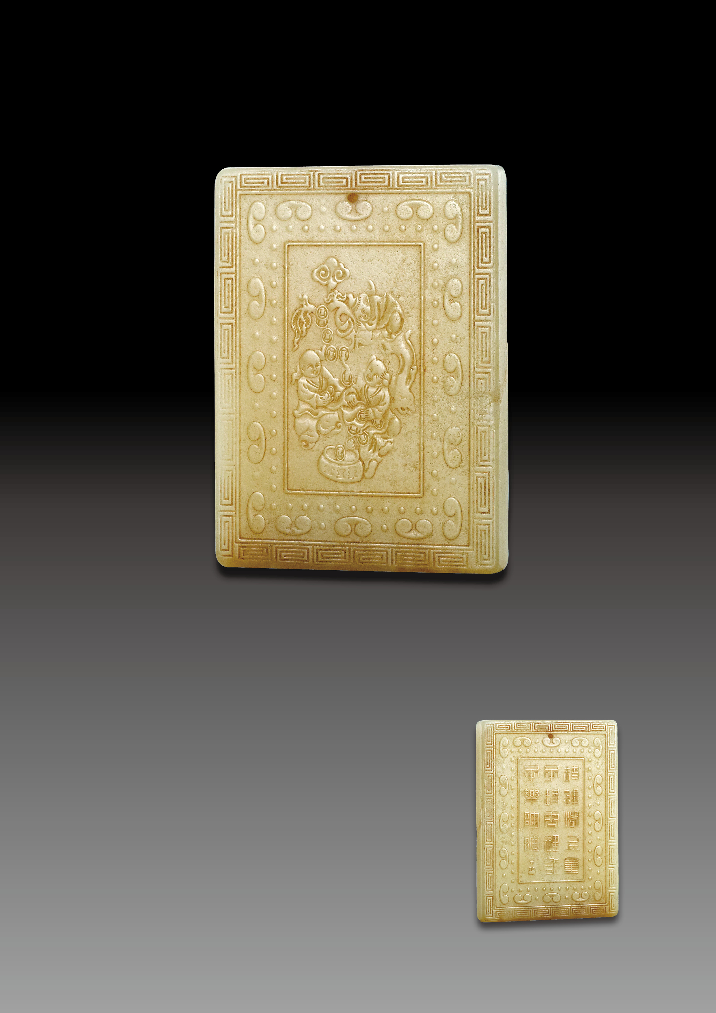 黄玉(大腰牌)玉呈浅黄色,造型端庄又大方,玉器完好无比,表面少许土褐色沁,正反两面有部分把玩磨损的痕迹,画面丰富且写意,正面画有戏鹦图、背面配题诗一首,画面精美、字体工整,可谓诗情画意,整件玉器通体不留白满文浅浮雕,霸气十足,是一件乾隆期的宫廷御玩。