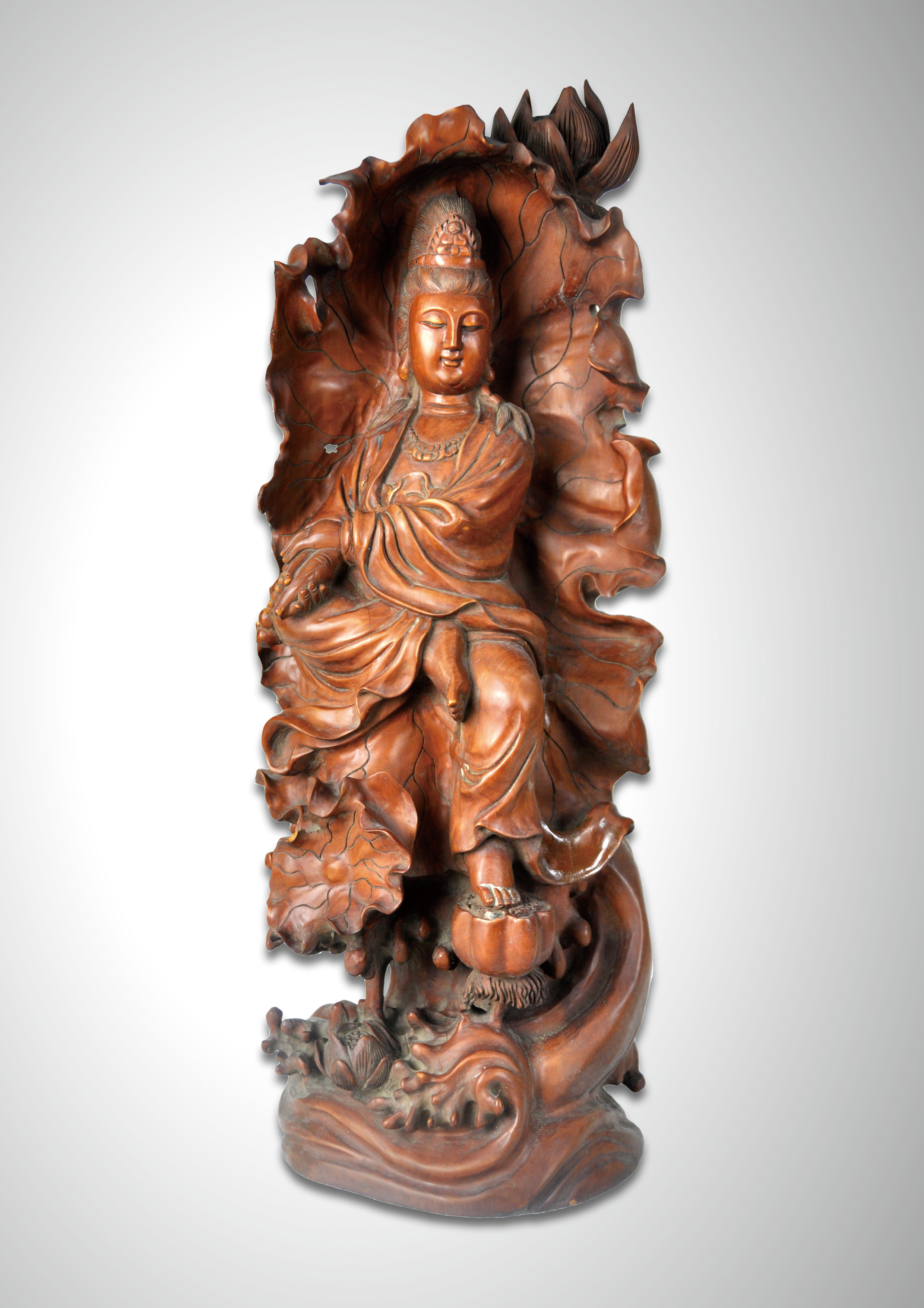 此件黄杨木雕观音,观音长身侧坐,脚踩莲花,身披天衣,高挽发髻,胸垂璎珞,左手持净瓶,右手搭左手,身形微侧,衣袂轻扬,于不经意间显露出神采。其面容安详,微合双目,如入物我两忘之境,澄明一片。人物肌圆骨润,庄严中不失女性的妩媚。
