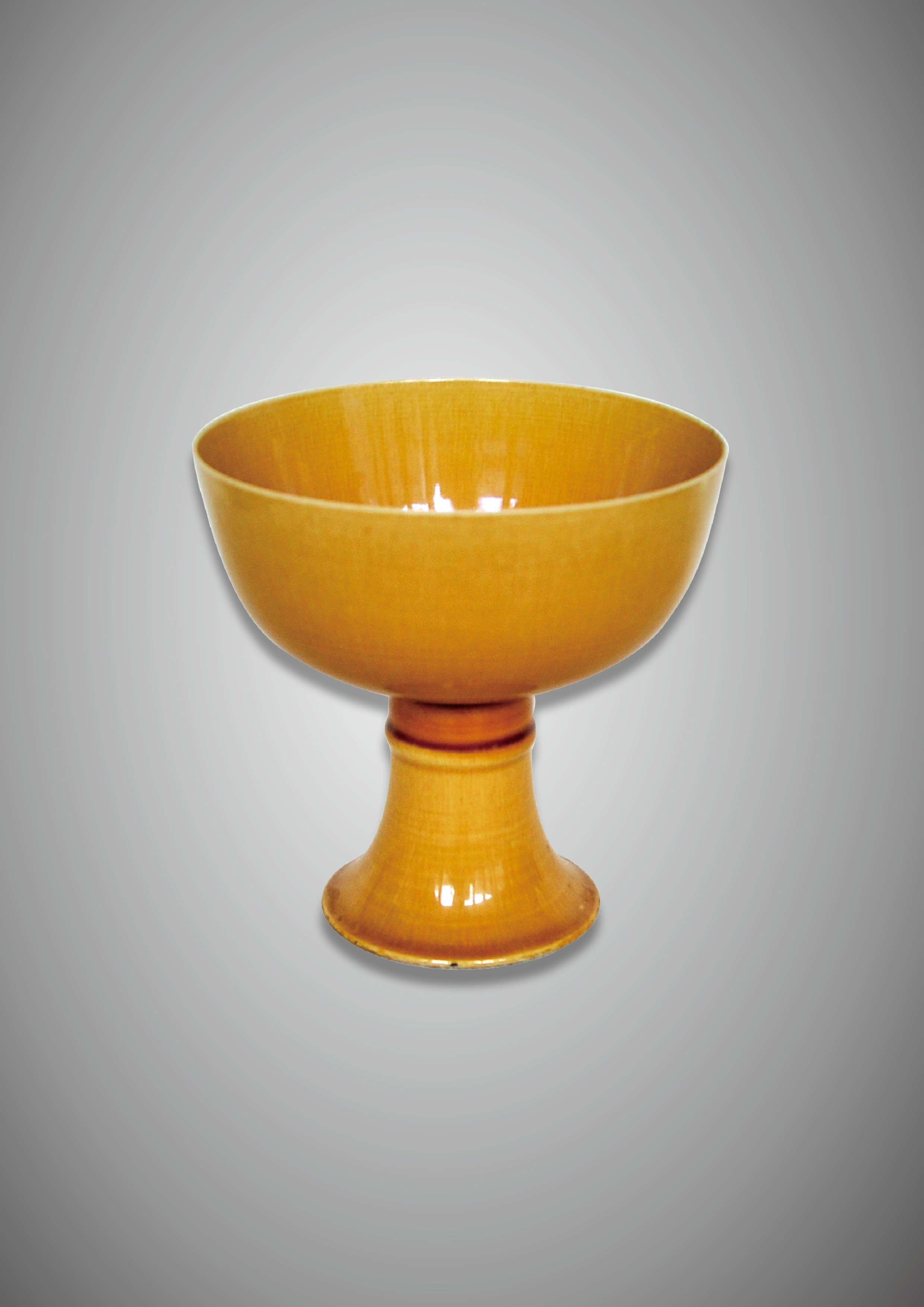 此件为清仿明成化高足杯。此杯胎薄釉黄,通体光洁,内外表光滑细腻,烧制工艺优良,杯与脚结合处吻合细密,杯底有“大明成化年制”六字款识。整体造型典雅,实为精品。